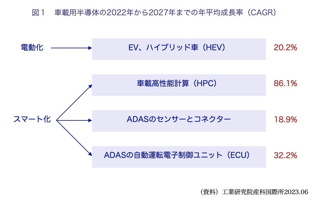 車載用半導体は現在、車体制御、安全システム用の割合が最も大きいが、27年にはEV、ハイブリッド車(HEV)向けの割合が23.9%と最大になる見通しだ。一方、22~27年の年平均成長率では車載高性能計算(HPC)向けが最大になる見込みだ。22年の新車に搭載された半導体の数は1台当たり平均1400個だったが、EVは1台当たり3000個に上った。 EVの普及に伴い、自動車サプライチェーン(供給網)の再編が進む見通しで、半導体と部品標準化の分野で強みを持つ台湾メーカーは異業種との提携により先行需要の取り込みが期待できる。