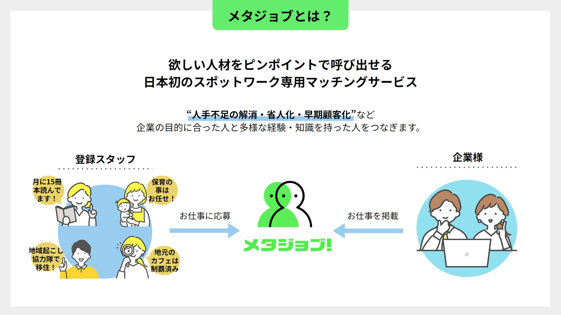 メタジョブ!は、人手不足による人材確保や省人化、若年層へのマーケティング・リサーチや早期顧客化など、企業の目的に合った知識・経験をもつ人材をピンポイントでオンライン上に呼び出すことができるサービスです。