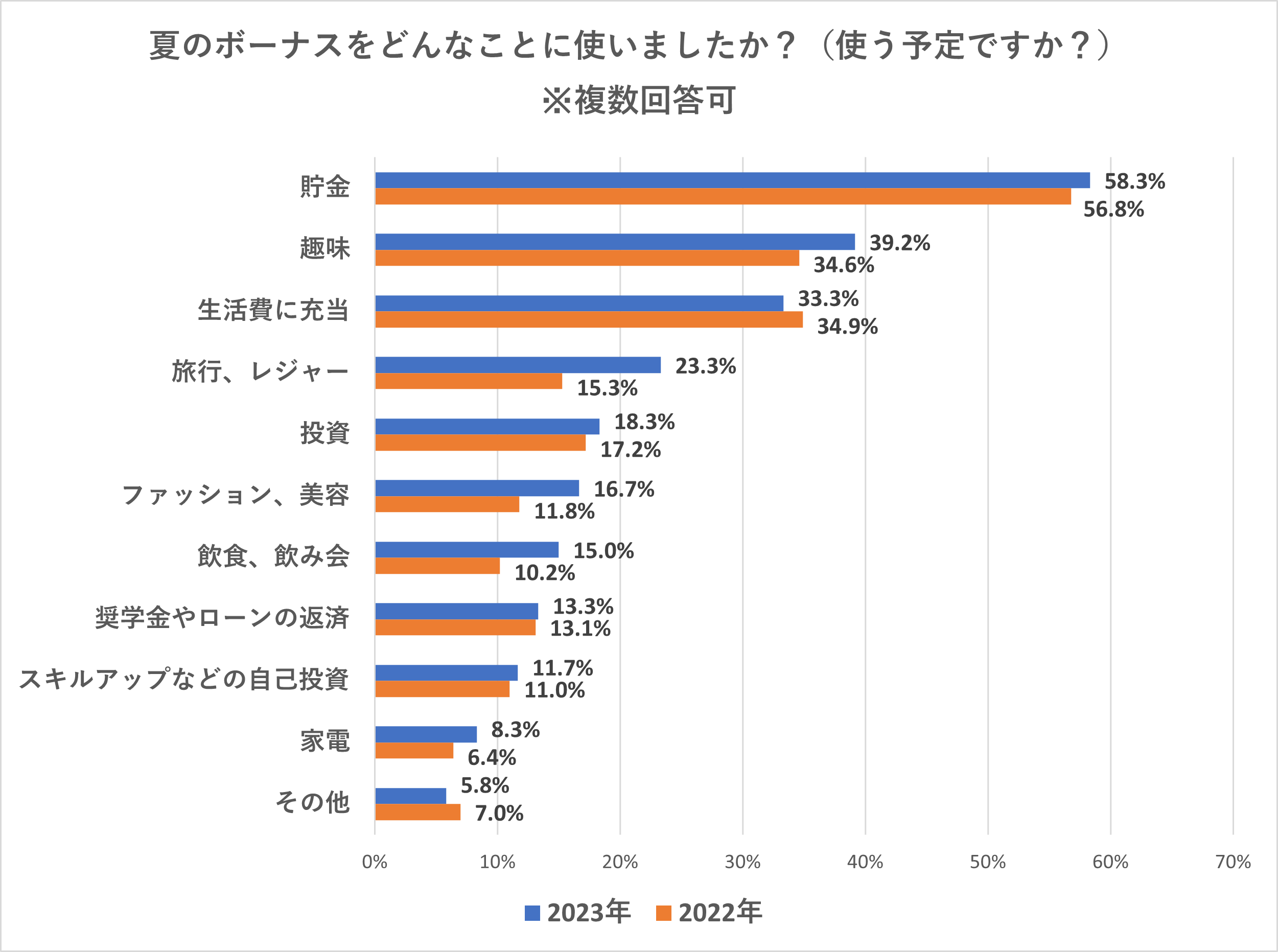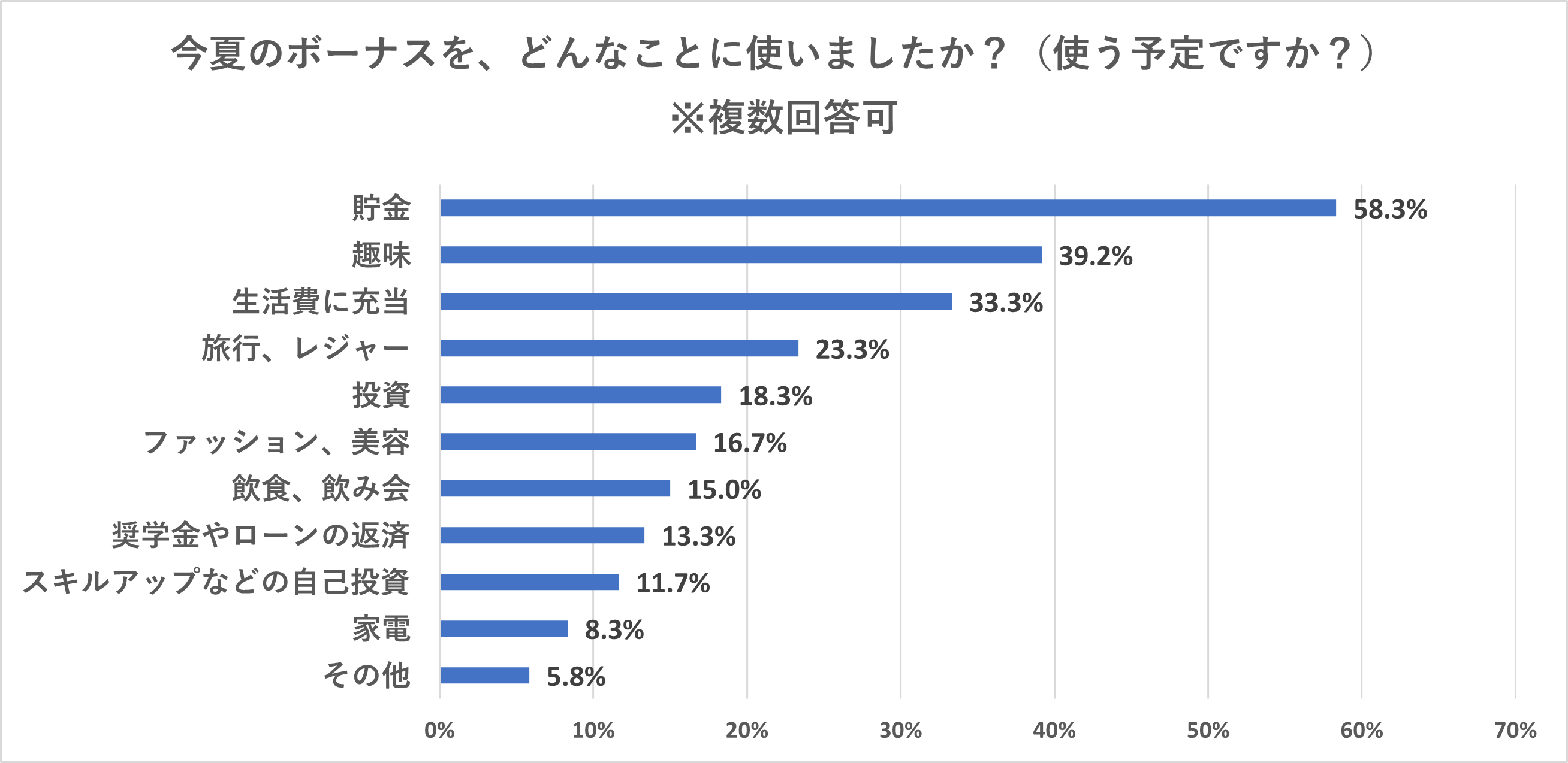 ■“今夏のボーナスの使い方”1位「貯金」(58.3%)、2位「趣味」(39.2%)、3位「生活費に充当」(33.3%)
