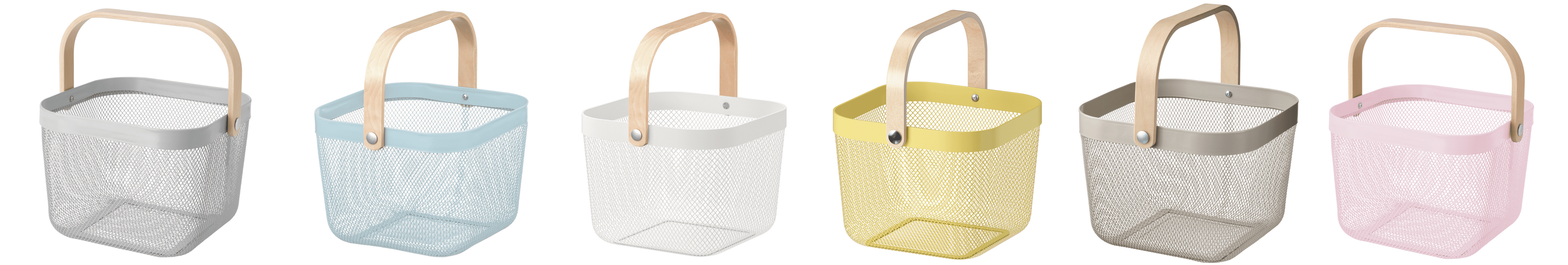 バーチ材突き板の持ち手とスチール製のバスケットの組み合わせが北欧らしいデザインで人気のRISATORP/リーサトルプ バスケットもお求めやすい価格になりました。事務用品はもちろん、キッチンや玄関、バスルームの小物の収納にも最適。いろんな場所へ持ち運ぶアイテムを入れるにも便利です。6色展開なので用途で色分けするのもおすすめです。