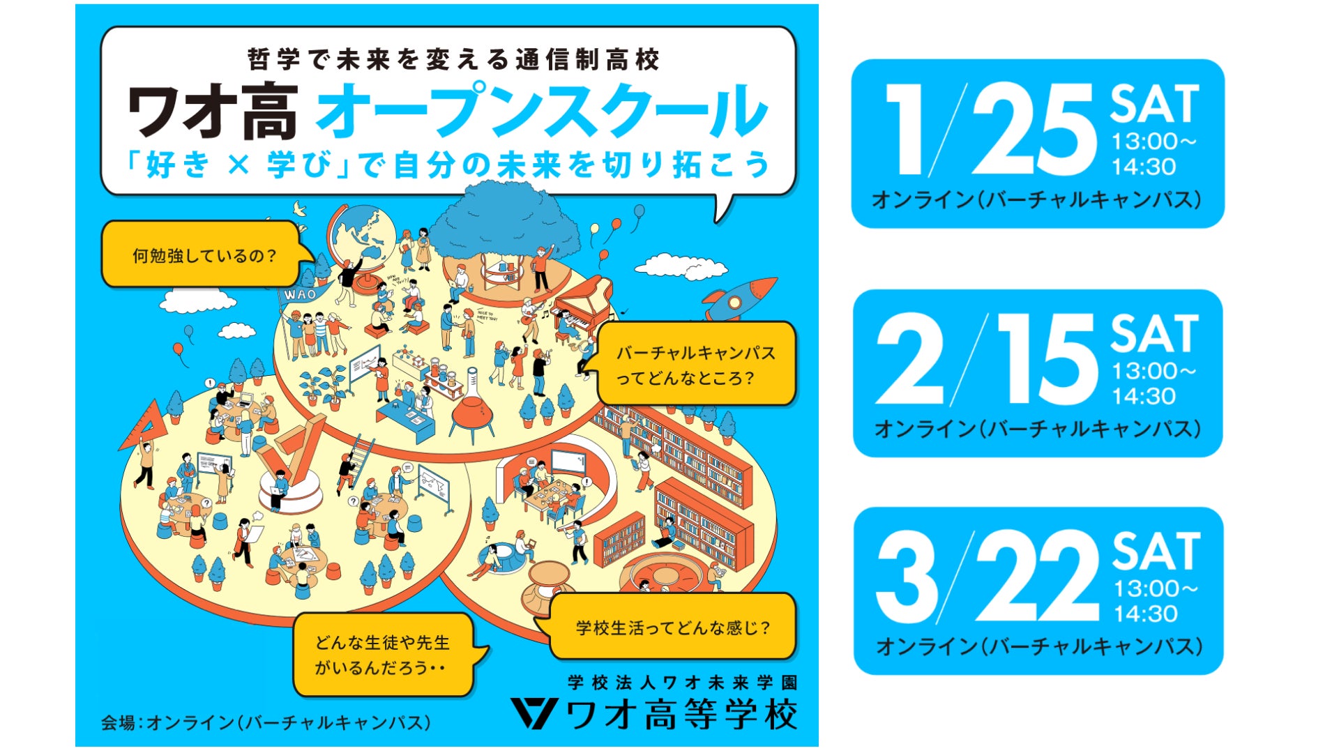 11人に1人が通信制高校に通う時代となり、「自由な時間の使い方ができる」「学校外の活動にも力を注げる」など、ポジティブな理由で通信制高校を選ぶ人も増えています。そんな生徒も多いワオ高校のリアルな姿が分かるとして好評を得ている「ワオ高オープンスクール」を1~3月もオンラインにて実施いたします。
