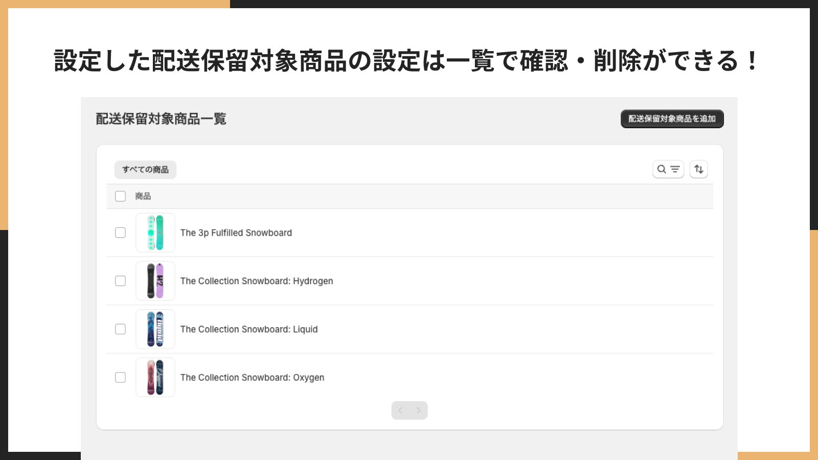 「シンプル配送保留|お手軽商品ごとの配送保留」では、設定した配送保留対象商品の設定を一覧で管理することができます。管理画面では、現在保留設定されている全ての商品を一目で確認できます。商品の在庫状況や販売状況に応じて、保留設定を素早くオン・オフできるため、柔軟な在庫管理が実現します。大量の商品を扱うストアでも、検索・フィルター機能により効率的な管理が可能です。