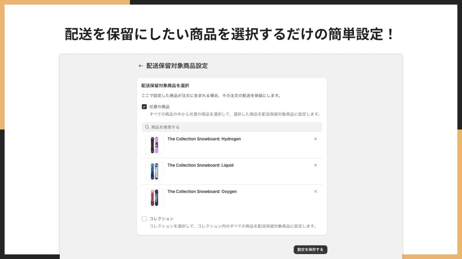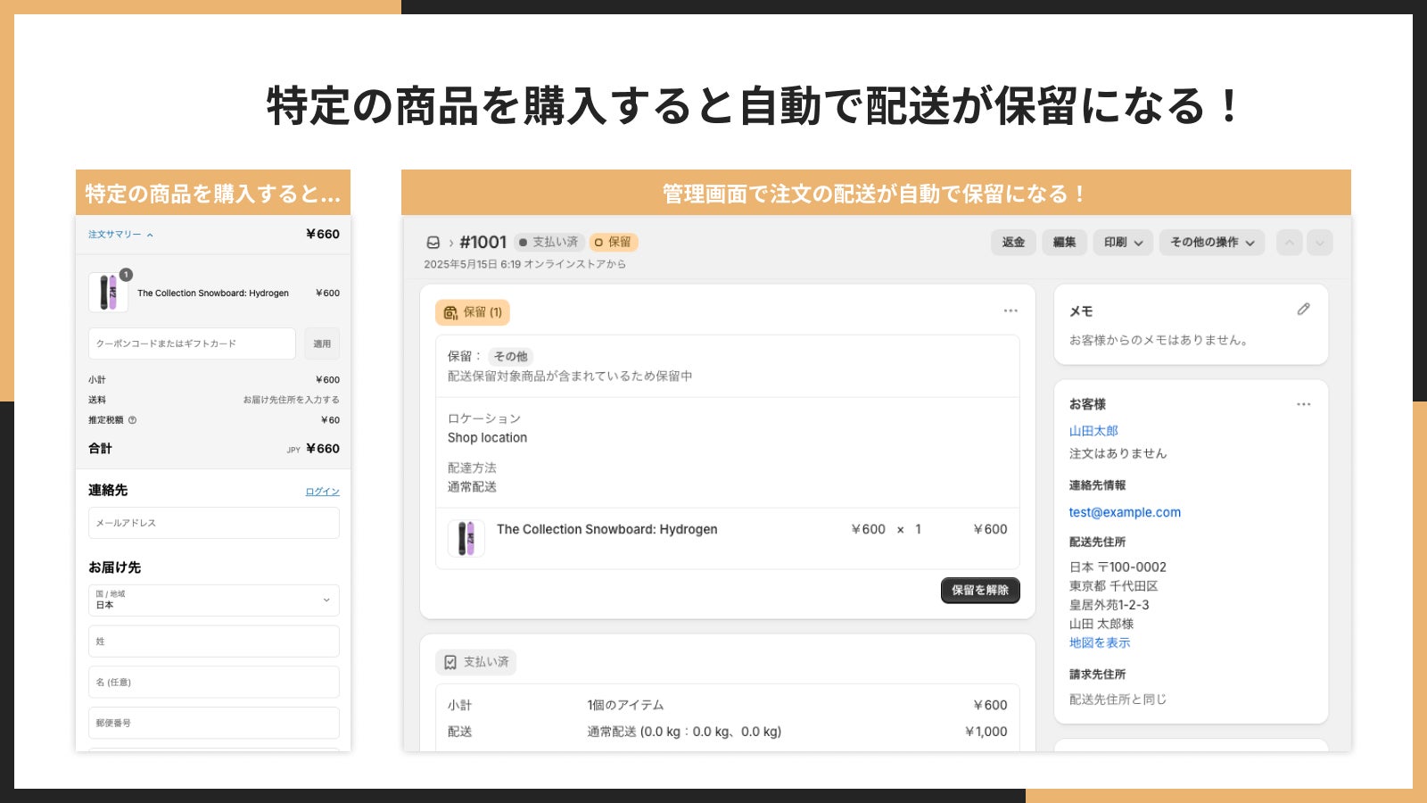 Shopify アプリである、「シンプル配送保留|お手軽商品ごとの配送保留」は以下の画像のように、特定の商品を含む注文を自動的に配送保留ステータスに切り替えることができるアプリです。このアプリを導入することで、複雑な配送管理を効率化し、ビジネスの成長に集中できる環境を整えることができます。