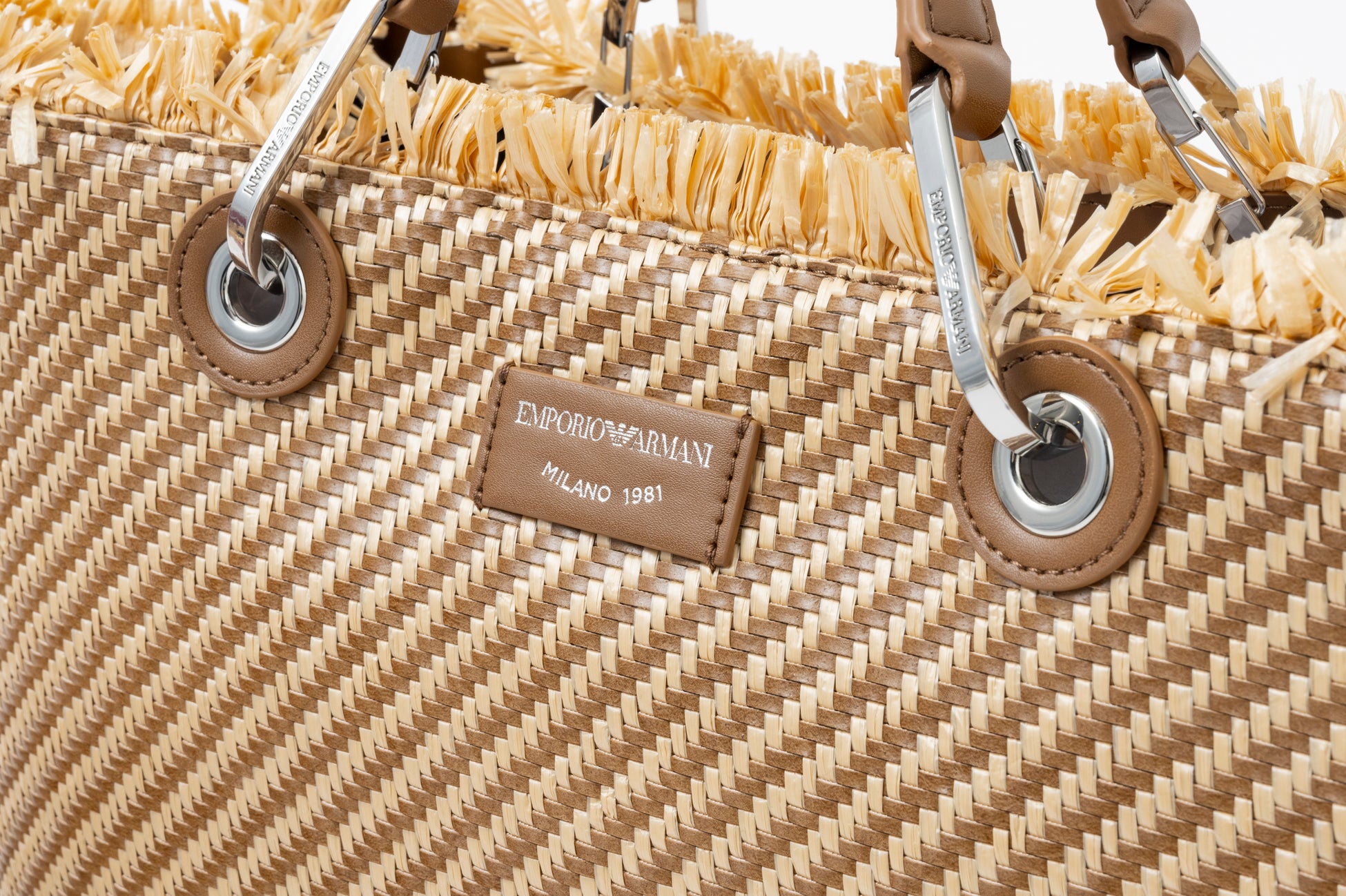 リラックス感を感じさせながらもエンポリオ アルマーニらしい高級感を損なわないよう、ディテールにもこだわりが詰まっています。ハンドルにはリアルレザーと見分けがつかないような高級感のあるイミテーションレザーが使用され、金具部分には輝きが美しいシルバーカラーを用いました。また、フロント部分にはEMPORIO ARMANIのブランドロゴを刻印したパッチで、さりげなくブランドを主張。