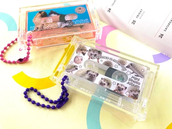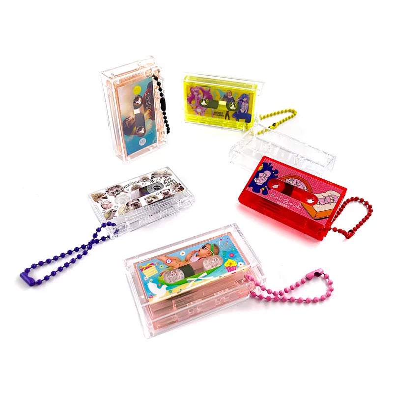 ME-Qで、懐かしくてかわいいカセットテープ風キーホルダーを1個から作成可能!スマホから簡単にデザインできる便利なサービスです。