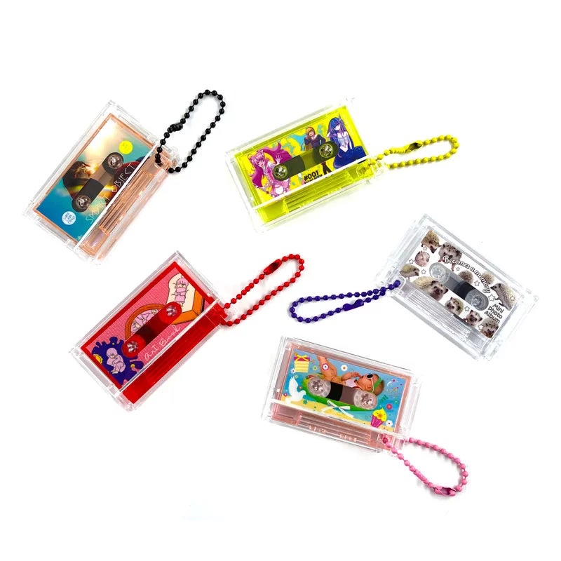 オリジナルカセットテープキーホルダーは、1個から手軽に作成可能。大ロット注文にも対応しており、イベントや販売用にもおすすめです。