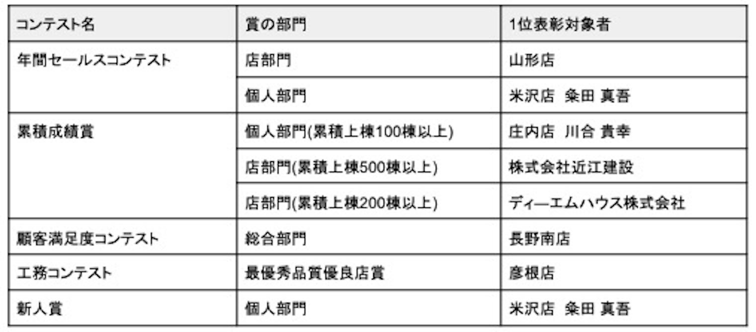 表彰式では、冒頭にフィアスホームカンパニープレジデントの佐藤 慎也より受賞者の皆さまをたたえるとともに、昨年度発表したキーワード「暮らしに、最適快を。」を実現するフィアスホームの「最適快住宅」が時代とマッチしてきたこと、今後のフィアスホームの方向性などを話しました。表彰式は、「期間コンテスト」「年間コンテスト」のそれぞれで、昨年1年間の加盟店の取り組みにおいて、高い業績を収められた店舗及び個人を表彰する業績表彰が執り行われ、参加した全員でその成果を称え合いました。既存の加盟店だけでなく、加盟間もない新規加盟店の皆さまも多くの場面で表彰を受けるなど、活気ある表彰式となりました。なお、2024年度の各コンテストの受賞者・受賞店は次頁の通りです。