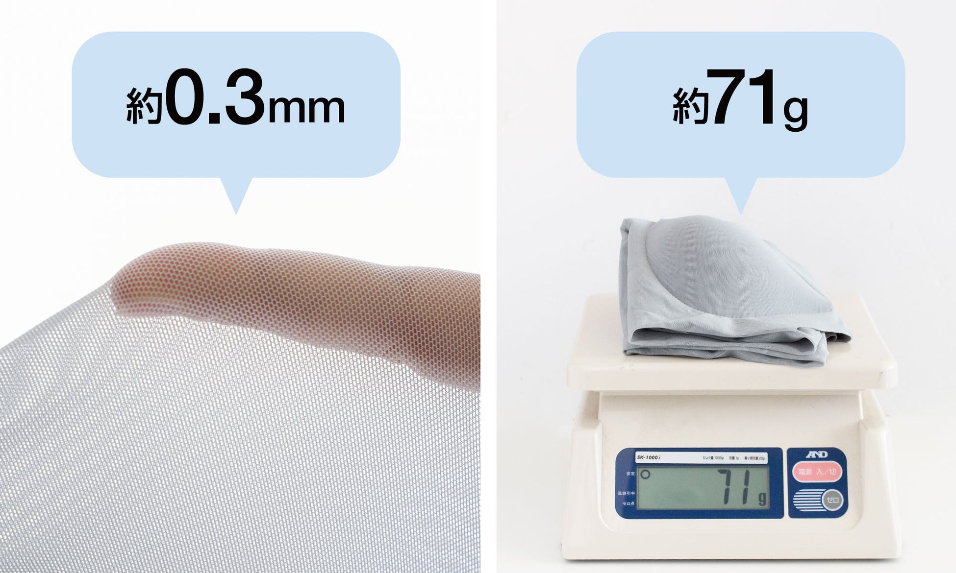 メッシュ生地はわずか約0.3mmほどで素肌と一体化するような驚きの薄さと軽さ!風が通って涼しい着心地です。