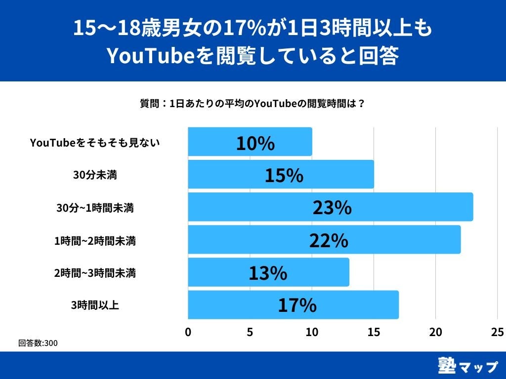株式会社SheepDog(東京都品川区)が運営する、塾・学習塾の口コミや料金の比較サイト|塾マップは、2023年2月に『YouTubeの視聴時間に関するアンケート』を行いました。