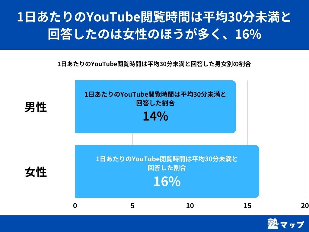 1日あたりのYouTube閲覧時間は平均30分未満と回答した割合を男女別でみてみますと、女性が16%、男性が14%という結果になりました。