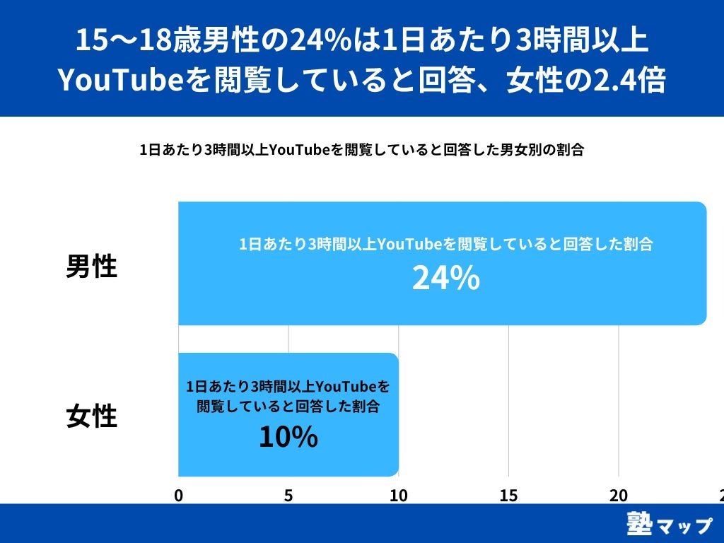 15~18歳男性の2割以上の方が1日あたり3時間以上YouTubeを閲覧しており、女性より2.4倍も多いことが分かりました。