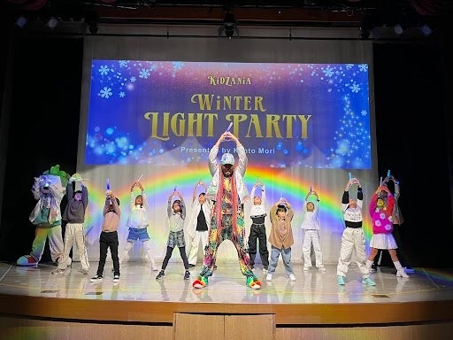 イベント期間中は、光と音楽に包まれたキッザニアの街の中で、光るグッズを身に着けてダンスを楽しむ「ウィンターライトパーティー」を実施。本企画は、世界的ダンスアーティストケント・モリ氏との夢のコラボレーション(※1)第2弾。ケント・モリ氏のプロデュース楽曲『RAINBOW』に合わせて、本企画のために考案されたオリジナル振付で踊るダンスパーティーです。