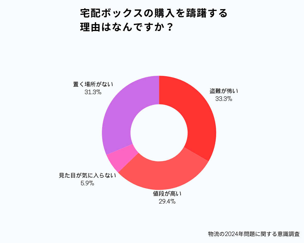 宅配ボックス導入の障壁となる要因に回答のばらつきは少なく、「見た目が気に入らない」が5.9%にとどまり、そのほかの要素は30%前後とほぼ均一の割合となりました。「盗難が怖い」という理由に関しては、宅配ボックスの防犯性の向上や、防犯性の高い宅配ボックスの認知が必要と言えそうです。