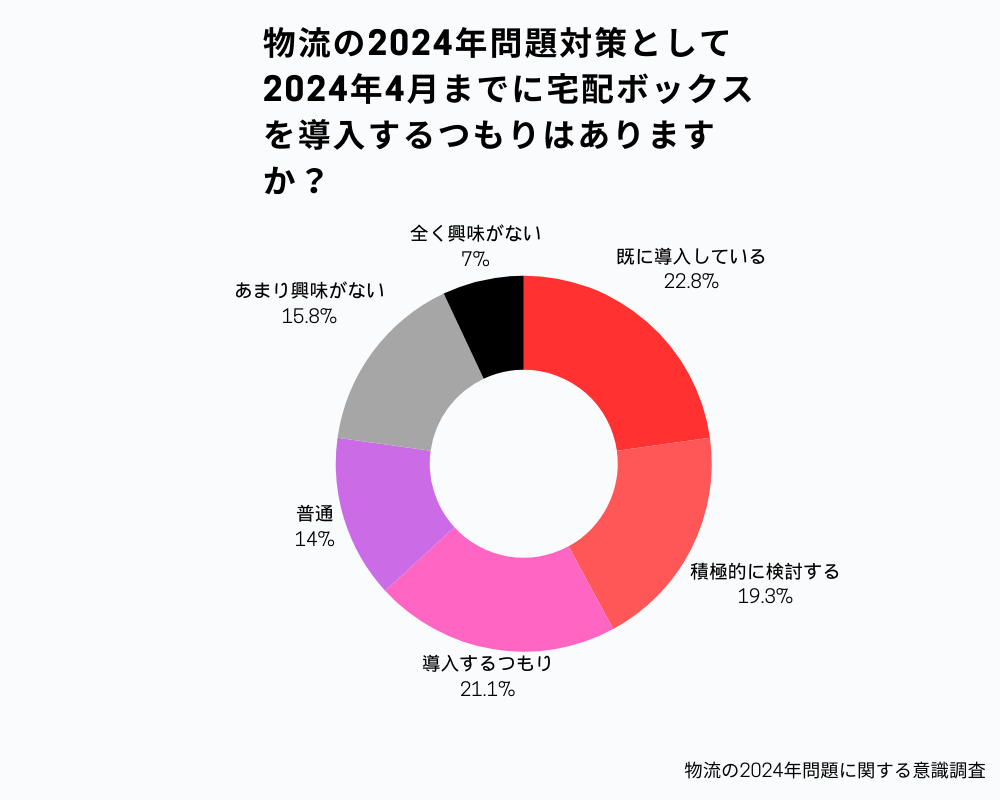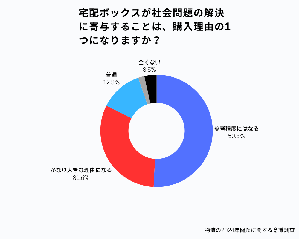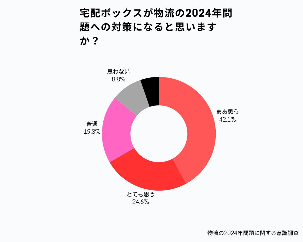 宅配ボックス導入への肯定的な見解が多数でした。「物流の2024年問題」→「宅配ボックス」という対策法に関しても半数以上の、消費者は認識している可能性が考えられます。