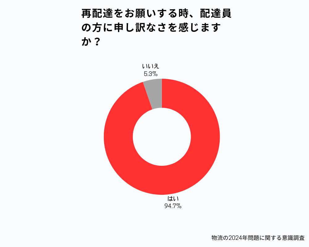 再配達が申し訳ないと感じる人は「約95%」と大多数を占めました。消費者としても、わざわざ同じ場所に何度も配達してもらうのは、罪悪感を感じていることがわかりました。