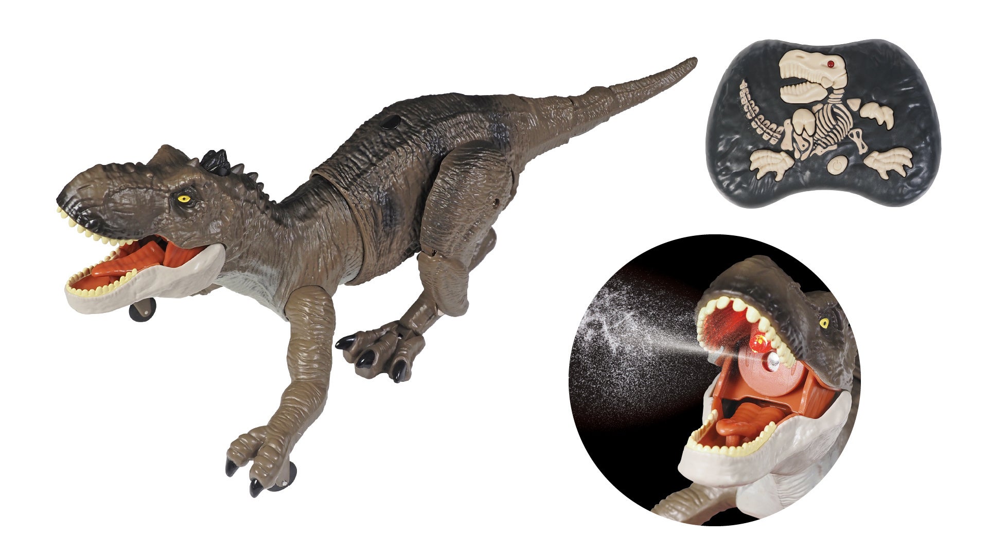 特徴:まるで本物!?全長35cmの大迫力の恐竜をキミの手で操ろう!口が光り、「グオォォォ!!」っと大迫力の咆哮(ほうこう)!煙のように口から放つ水蒸気は鳥肌モノ!オートモード搭載で、自動で動くから操作が苦手でもご安心あれ。本物のように尻尾をブンブン振って動く姿が圧巻!