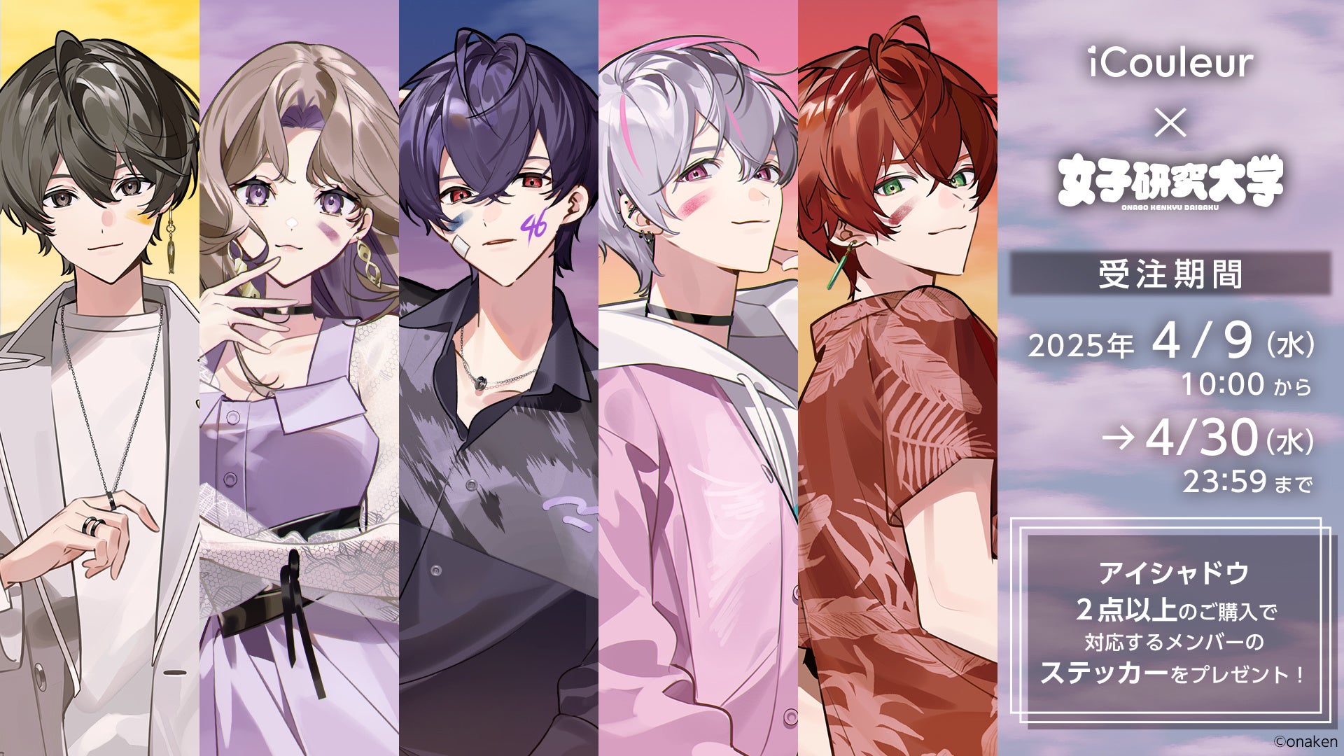 株式会社サイバーエージェント(本社:東京都渋谷区、代表取締役:藤田晋、東証プライム上場:証券コード4751)は、コスメブランド「iCouleur(アイクルール)」より、実況者グループ『女子研究大学』とコラボしたコスメを、2025年4月9日(水)より販売することを決定いたしました。『女子研究大学』の5人をイメージしたカラーのアイシャドウパレットとなっており、2点以上のご購入で該当メンバーのステッカーをプレゼントいたします。