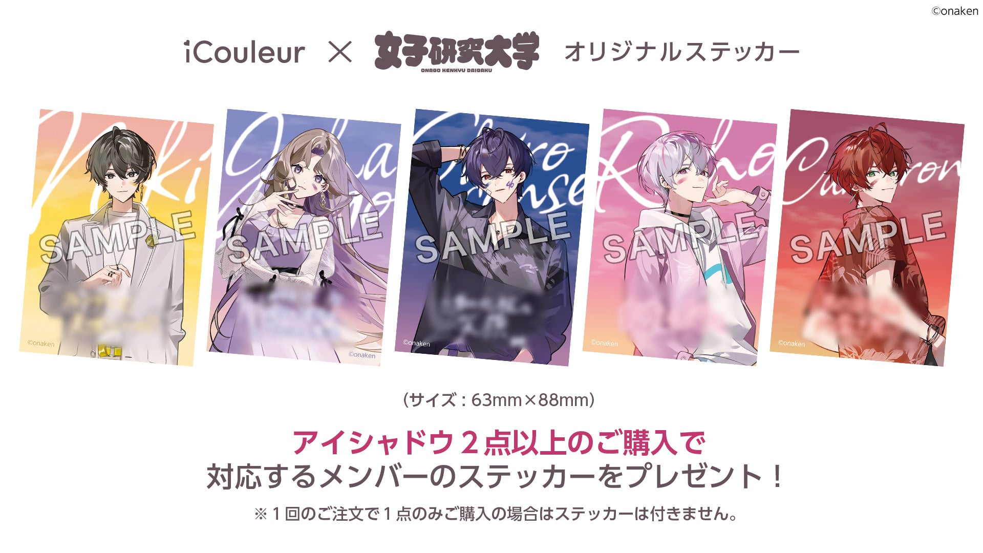 「女子研究大学×iCouleur アイシャドウパレット」を2点以上ご購入いただくと、該当するメンバーのステッカーをプレゼントいたします。ノベルティプレゼントに関しては下記の詳細と注意事項をご確認ください。