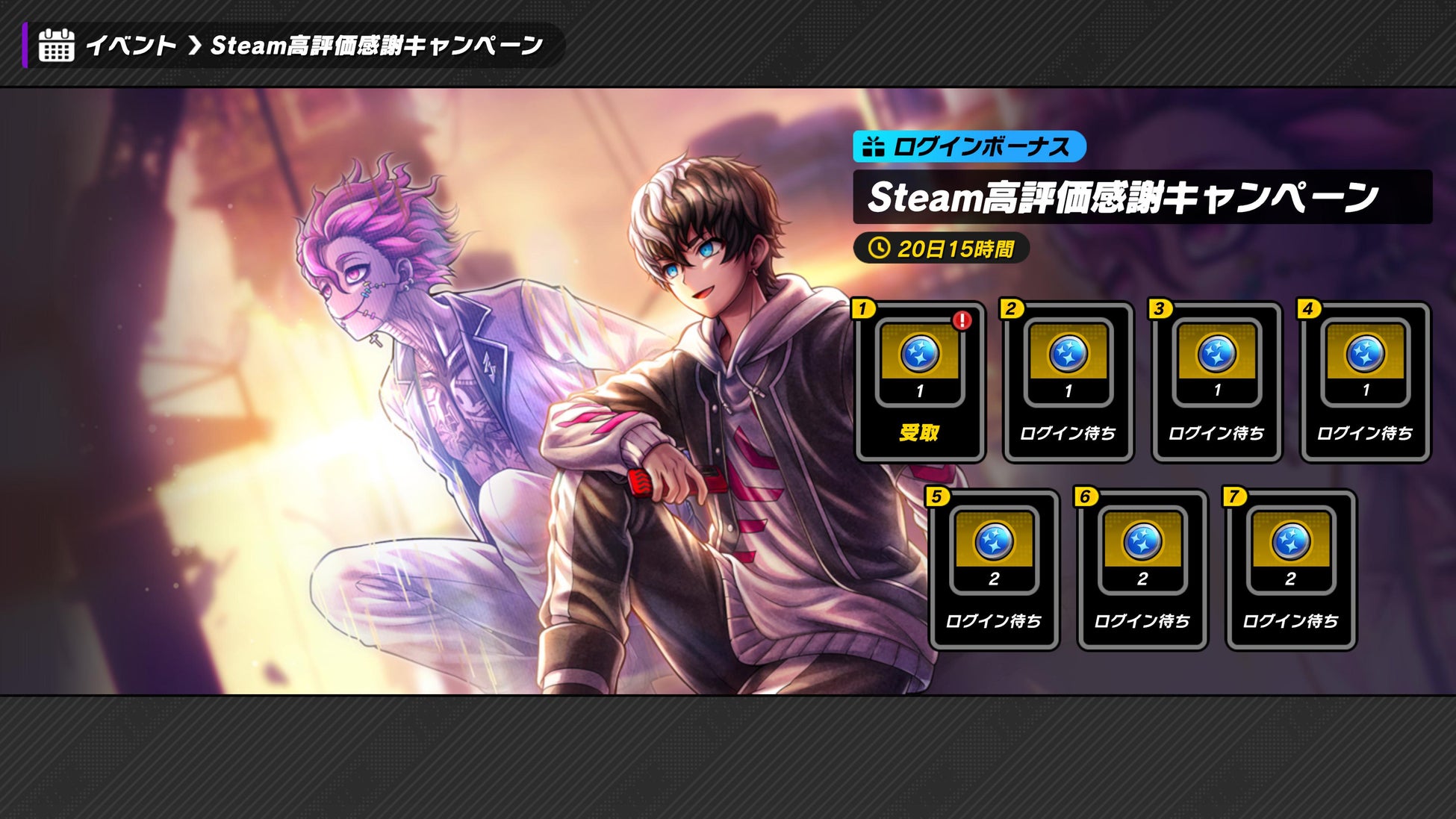 ◆Steamレビュー「非常に好評」獲得記念!最大10連分のシンクロメダルが手に入るログインボーナスが開催中!