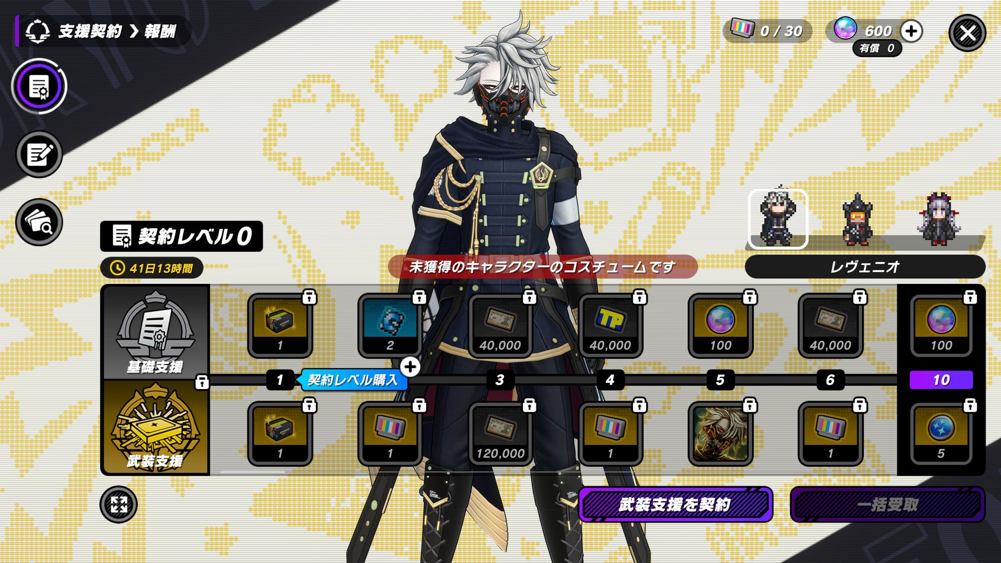 Ver1.1.0アップデート後より、ゲーム内で「支援契約 レヴェニオ編」が開催中です。