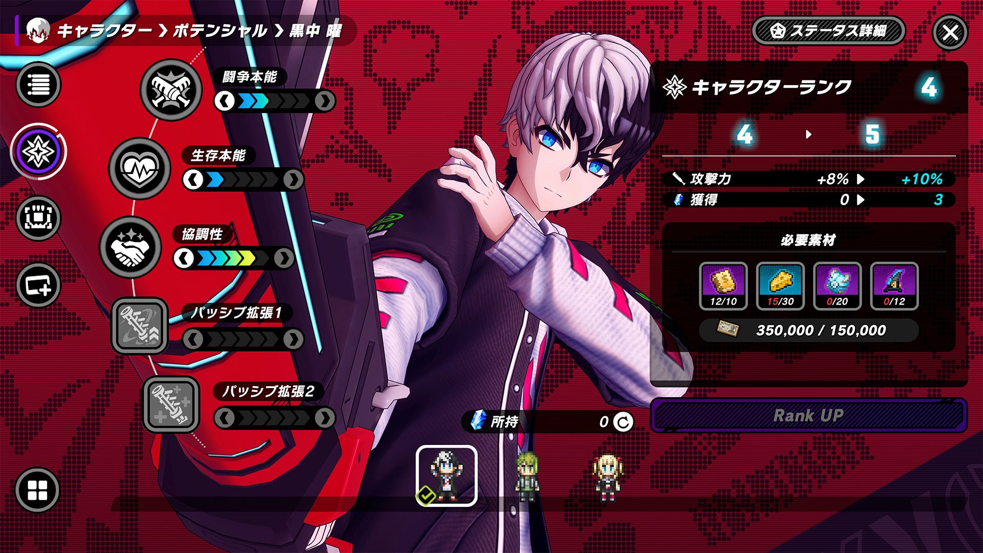 本作では、キャラクターたちの個性をより際立たせる、自由度の高い育成システムを採用しています。レベルアップやステータスの割り振り、装備品の付け替えなどを通じて幅広いビルドが可能です。