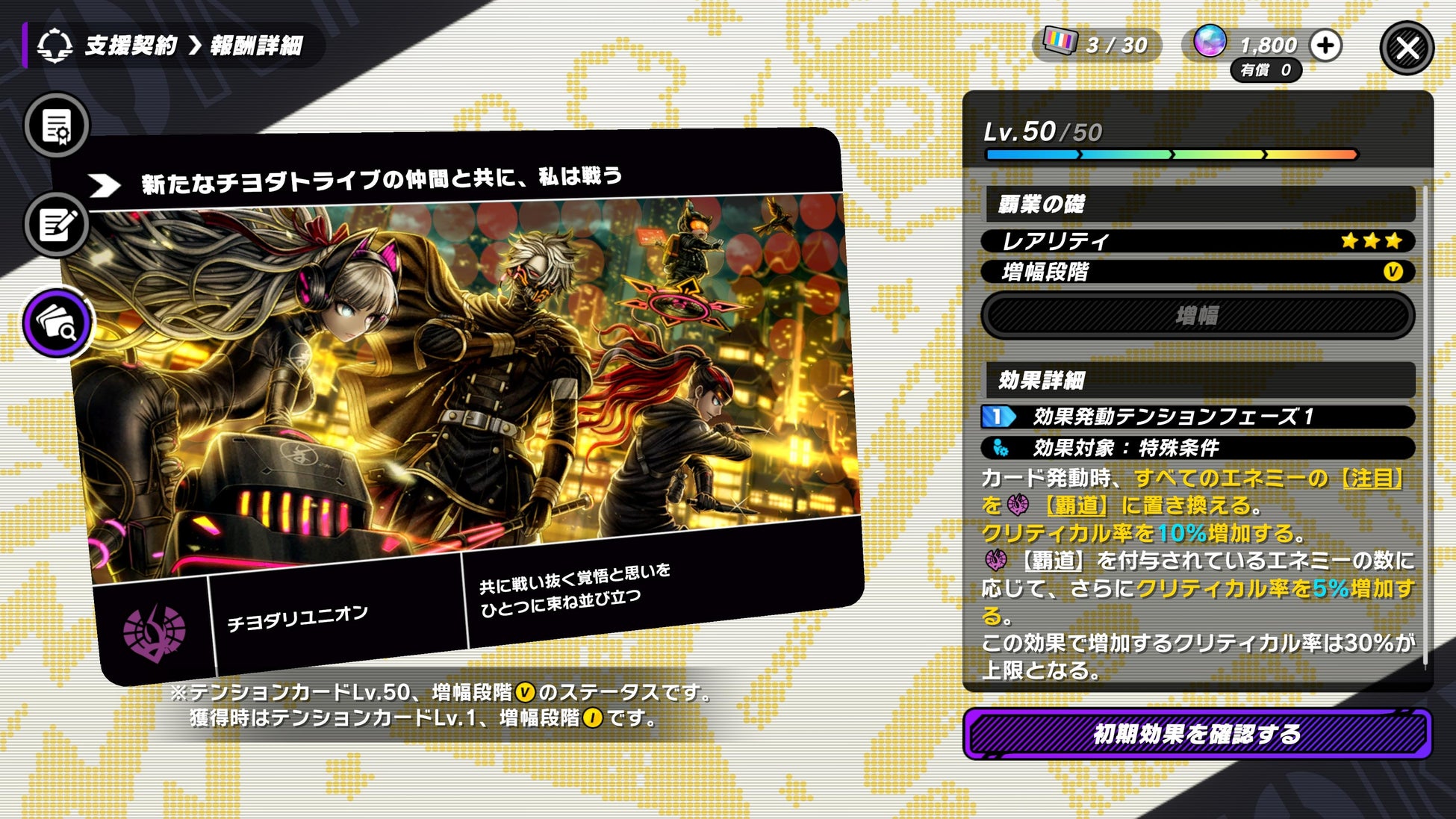 ver1.1.0アップデート後より開始となる「支援契約 レヴェニオ編」では、有償エニグマエンティティでアップグレード可能な「武装支援」の報酬として、Qや秋葉 ひなぎくらの専用コスチューム、★3テンションカード「覇業の礎」などをご用意しています。