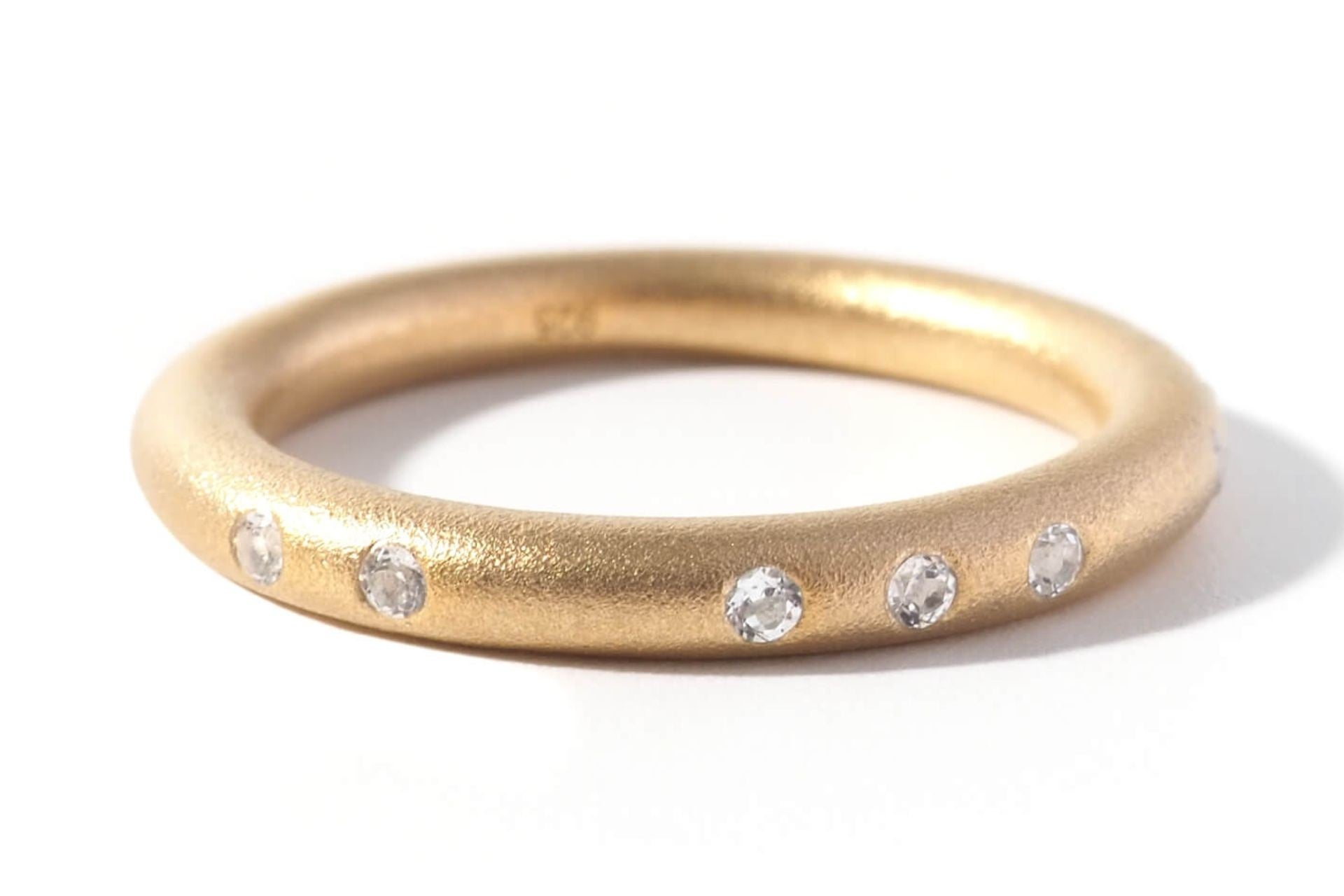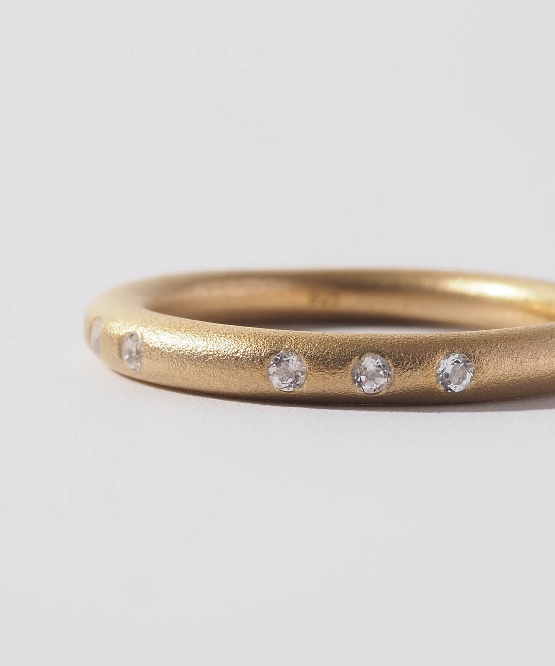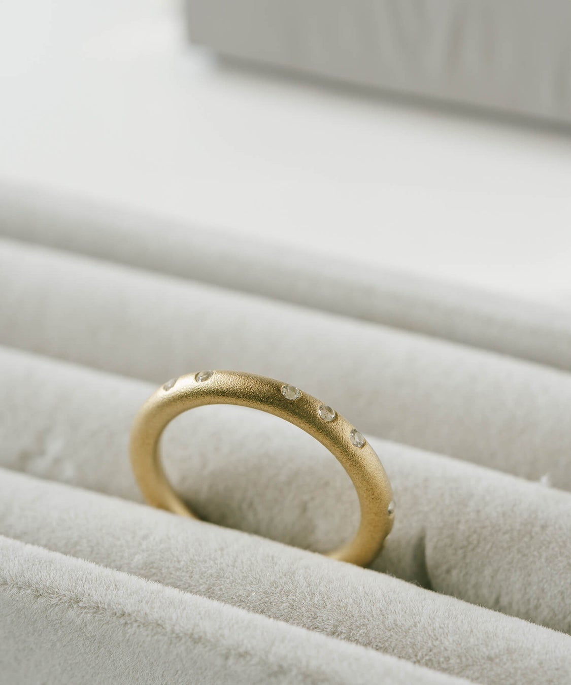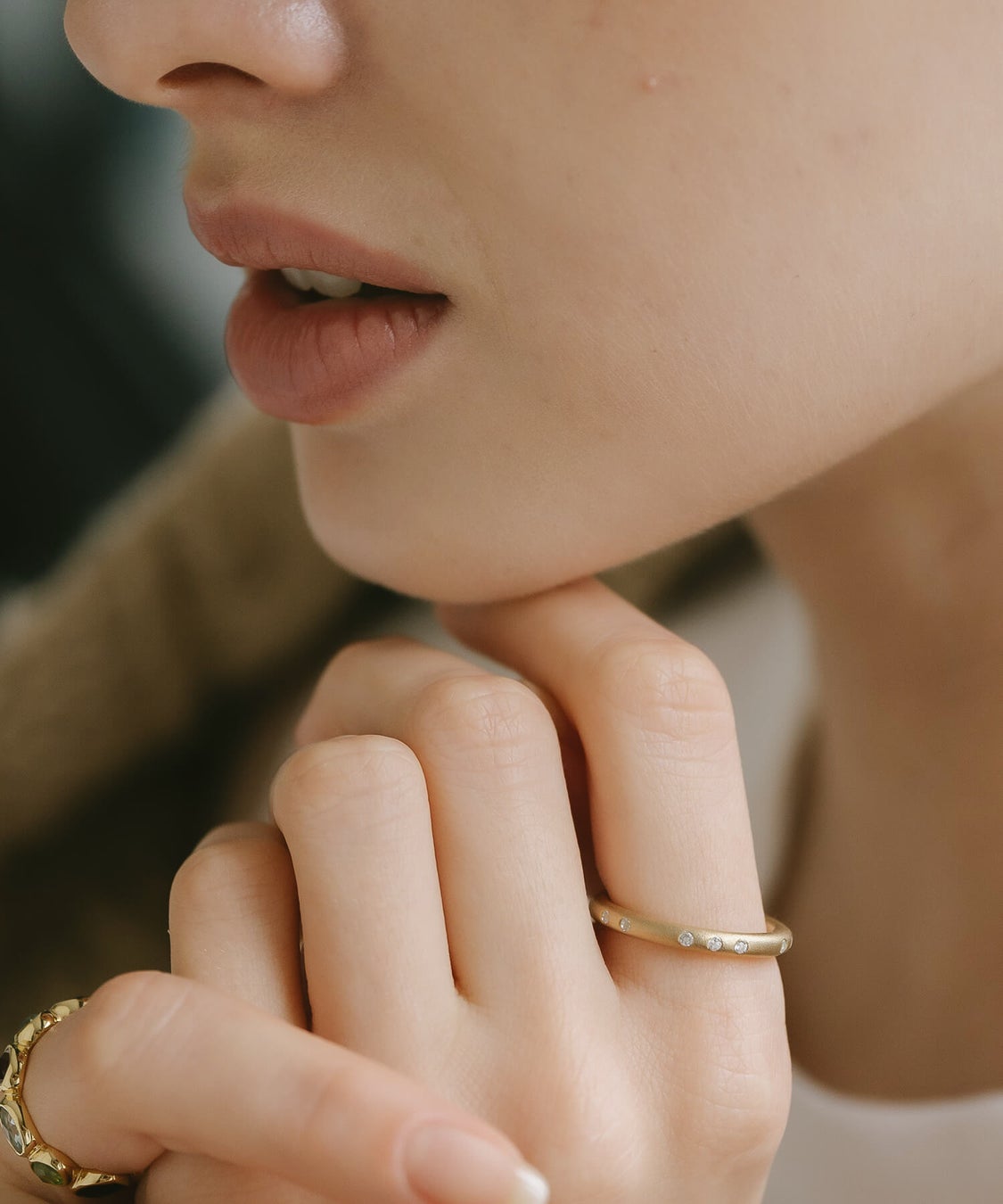 サンスクリット語で「光の輪」を意味する言葉、Prabah -プラバ-。インド・ジャイプールの香りと共に纏う、光の街に沈む夕日を思わせるオリエンタルな輝き。マットなゴールドリングは、落ち着いた大人の雰囲気を演出し、指元で存在感を放ちます。厚めの18金ゴールドメッキで色持ちUP。