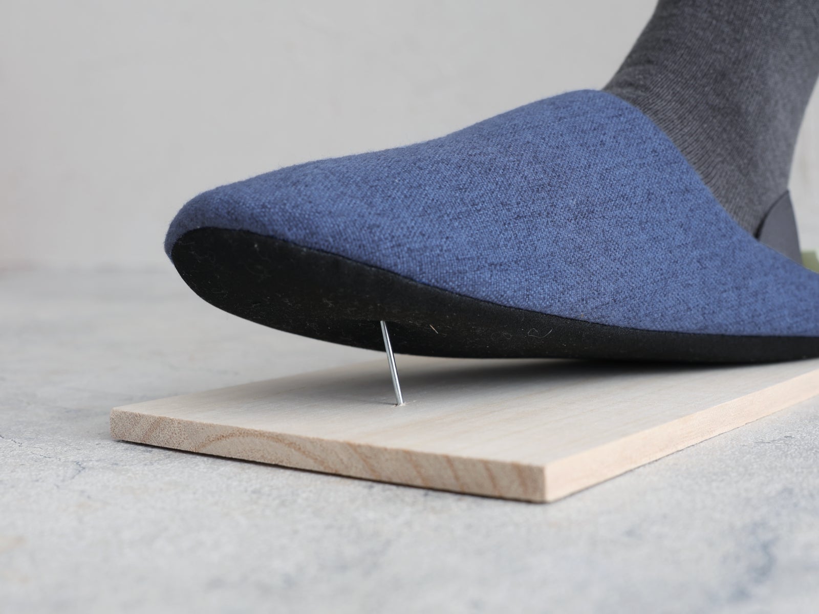 踏み抜き防止シートとは、強度の高いポリエステルベースの合成繊維を編み込んだシート。第三者機関による耐踏抜き性試験をクリアし、安全性が実証されたスリッパです。