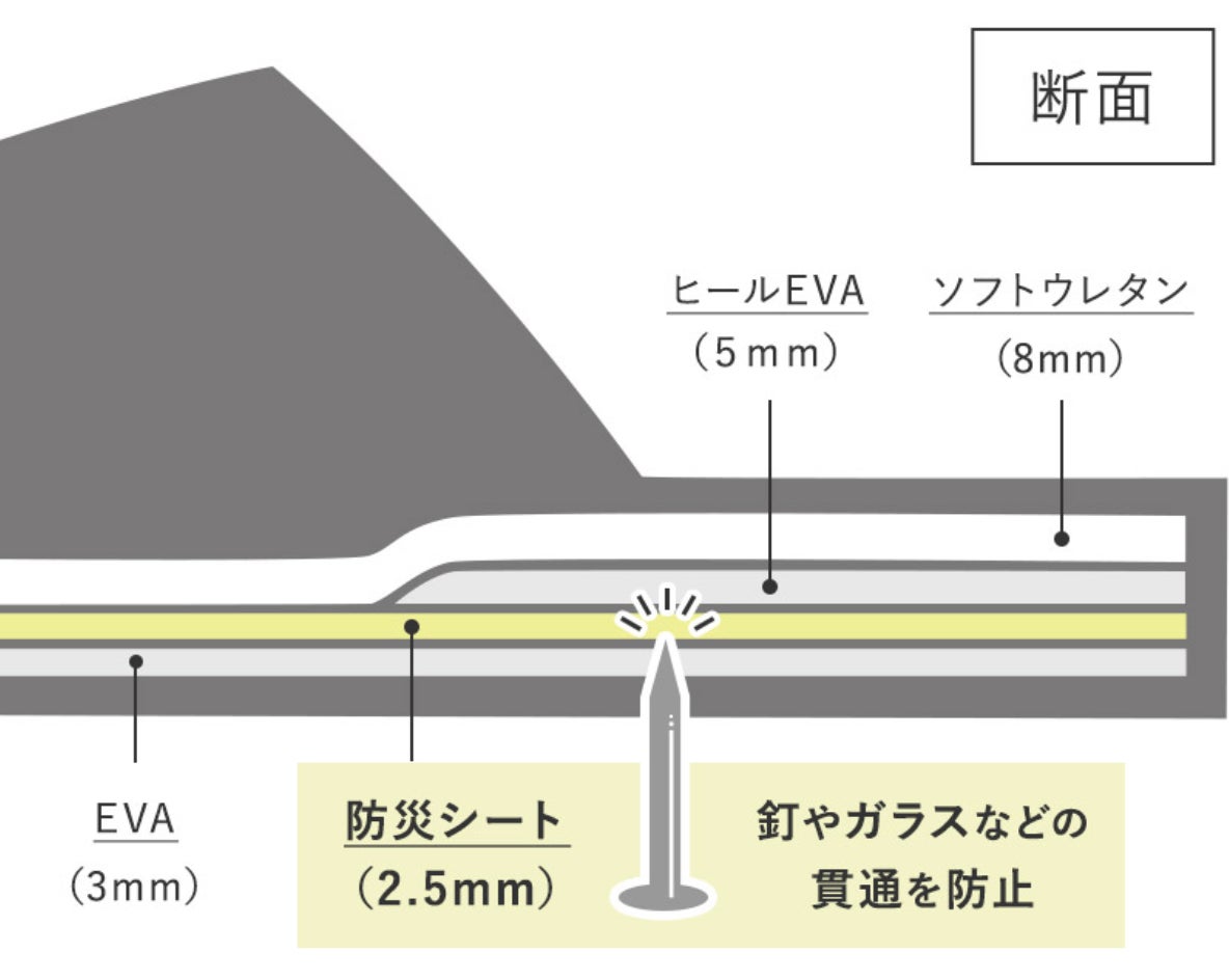 災害時に釘やガラスの貫通を防げるよう、ソール部分に踏み抜き防止シートを使用。