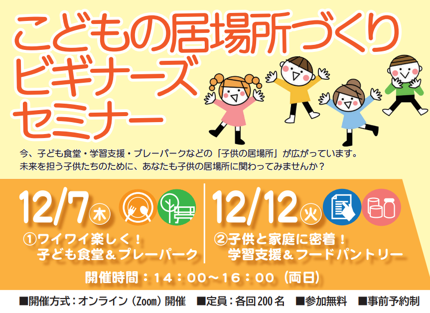 ※12月7日(木曜日)開催の「ワイワイ楽しく!子ども食堂&プレーパーク」、12月12日(火曜日)開催の「子供と家庭に密着!学習支援&フードパントリー」 の両方にご参加いただくことも可能です。