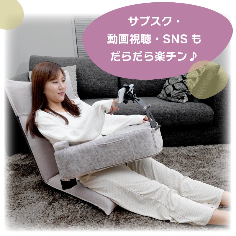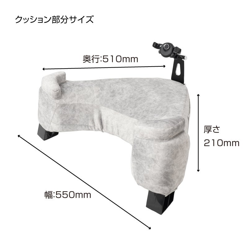 高さ510×幅550×厚さ210mm。アルファベットのAのような形状でお腹部分でかかえるように使用します。ひじを押さえる段差があり、腕をクッションに置いて操作が出来る為、長時間でも疲れにくく快適に操作が行えます。クッションに取りつけられるスマホアームが付属。横幅8.2cmまでのスマホに対応。スマホを手に持たずにスマホを見ることが出来ます。スマホホルダー部を取り外せばタブレットを置くことも可能。