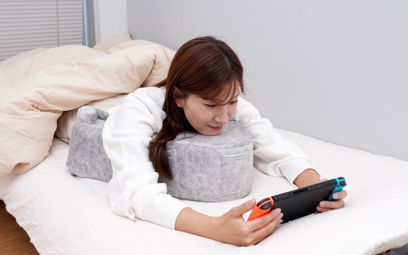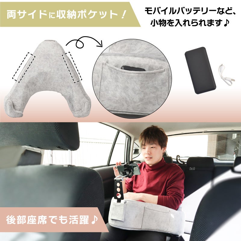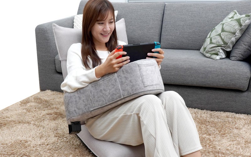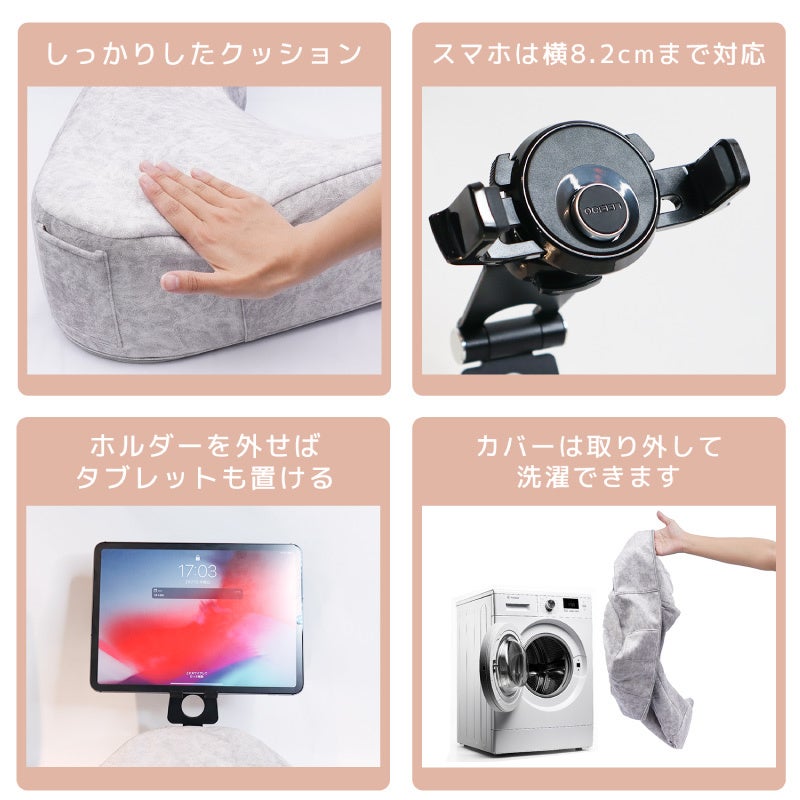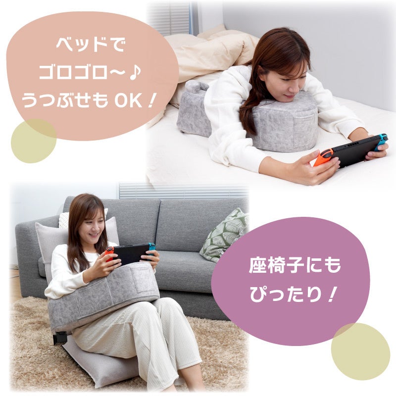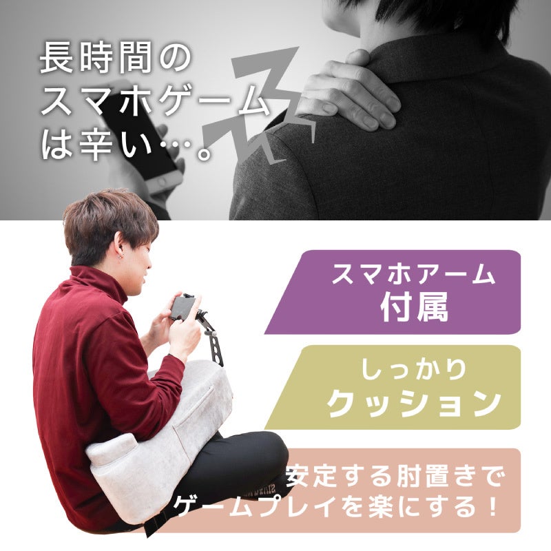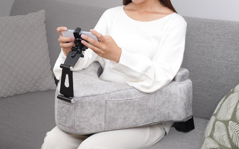 本製品は座った状態でスマホやゲームを快適に操作できるスマホホルダー付きのクッションです。