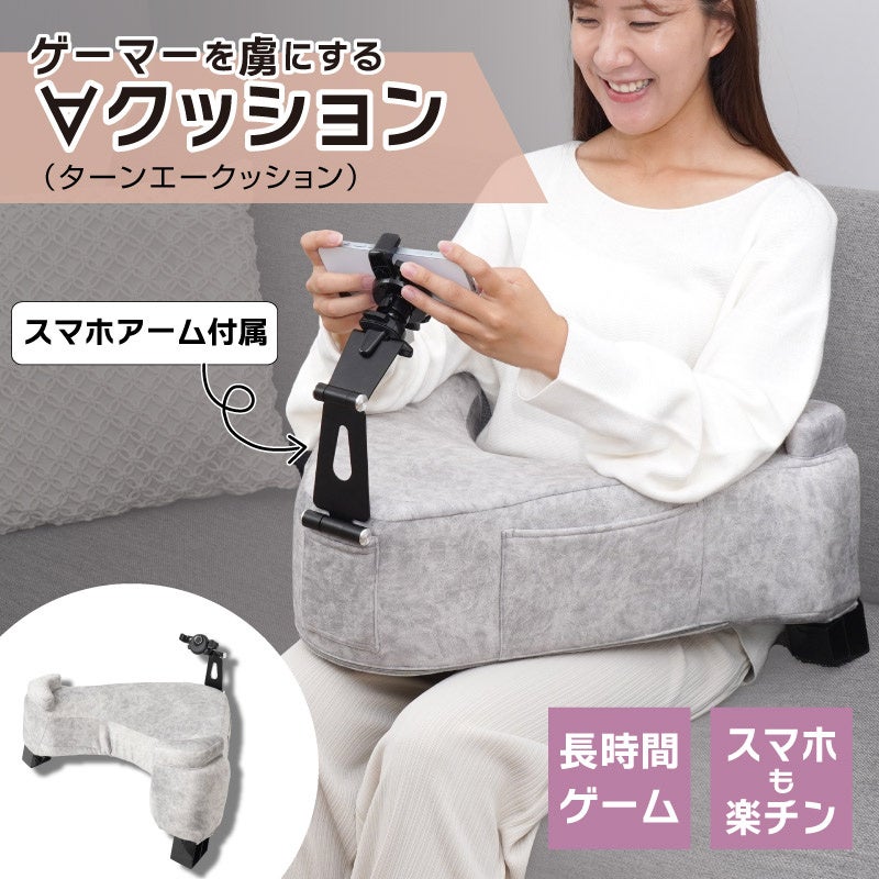 スマホやゲームを快適に操作したい。スマホやゲームをしていて腕や肩が疲れる。一般的なクッションだと体重をかけると重みでつぶれてちょうど良い形にならない。そんな方にお勧めの「∀クッション」(ターンエークッション)です。