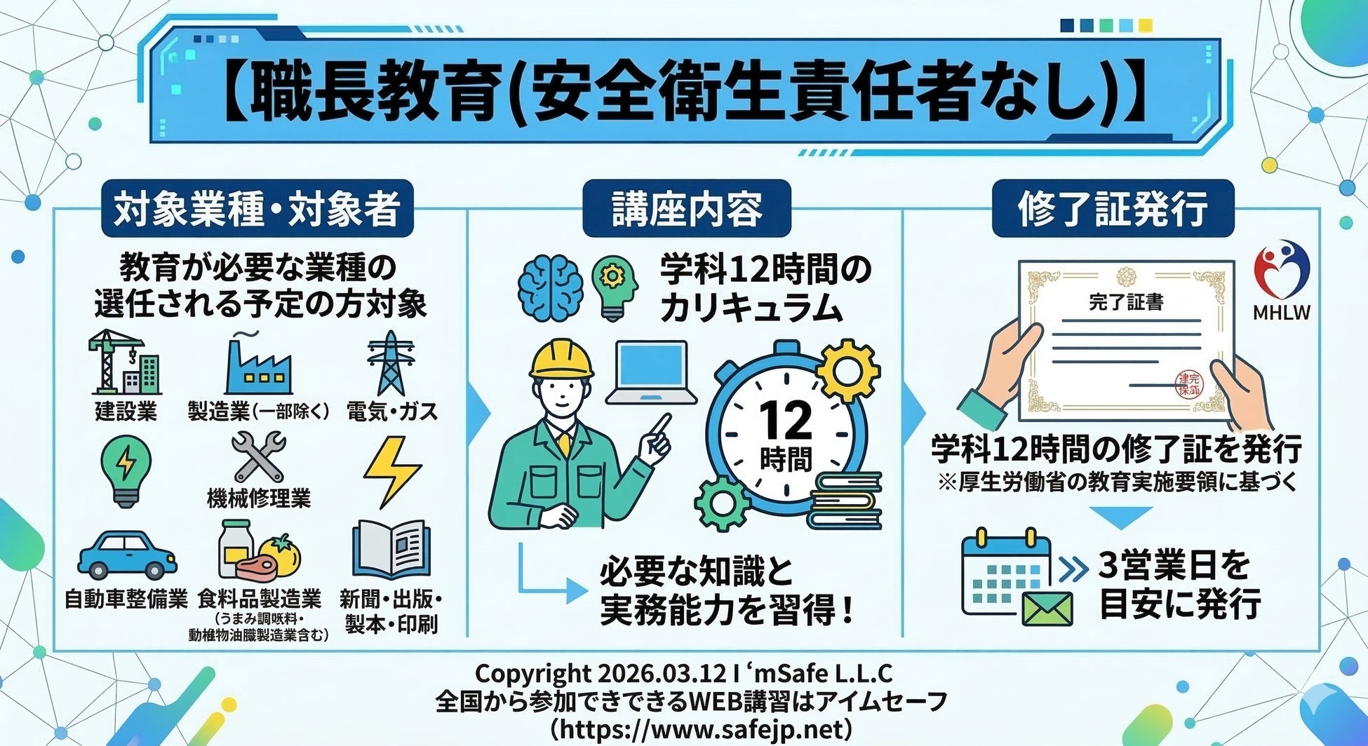 アイムセーフ合同会社では、厚生労働省通達による【職長教育(安全衛生責任者なし)】を社内や自宅から受講できる便利なオンライン講習会で実施しています。