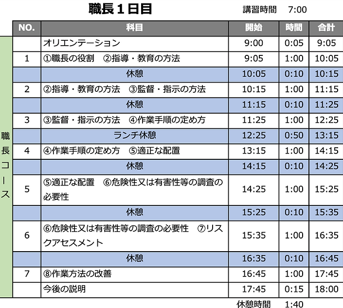 建設業、製造業(一部除く)、電気、ガス、機械修理業、自動車整備業、食料品製造業(うまみ調味料製造業及び動植物油脂製造業は、すでに対象)」、「新聞業、出版業、製本業及び印刷物加工業」など教育が必要な業種の選任される予定の方対象に、必要な知識と実務能力を習得していただくため、学科12時間のカリキュラムによる講習です。