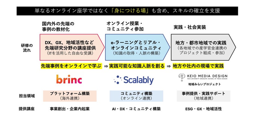 香港を拠点とした世界的アクセラレーター「Brinc」の日本法人であるBrinc Japan株式会社(本社:東京都港区、代表取締役:岡澤 恭弥、以下、Brinc)、コミュニティを軸にした新たなマーケティングソリューションを開発するScalably株式会社(本社:東京都港区、代表取締役:山本 純矢、以下 Scalably)と慶應義塾大学大学院メディアデザイン研究科(所在地:横浜市港北区、研究科委員長:稲蔭正彦 以下、KMD)は、産学官金連携により行ってきた地方創生プロジェクトで培ったグローカルな社会実装の知識・経験ノウハウと、海外のDX・GXなどの先端事例を組み合わせた「社会課題解決リスキリング特別講座」の提供を開始します。少子高齢化の進行など、世界的にも将来を見据えた課題解決の場となっている日本の地方を舞台に、企業の事業創出やESG対応、AIの事業利活用など、企業活動の市場変化への対応をeラーニングとリアルプロジェクトを通じた社会実装を通じて支援します。