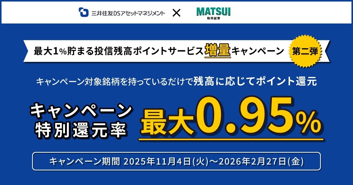 松井証券株式会社(本社:東京都千代田区、代表取締役 社長執行役員:和里田 聰、以下「当社」)は、2025年11月4日(火)より、三井住友DSアセットマネジメント社の「大和住銀DC国内株式ファンド」「アクティブ元年・日本株ファンド」を対象に、「最大1%貯まる投信残高ポイントサービス増量キャンペーン」を実施します。