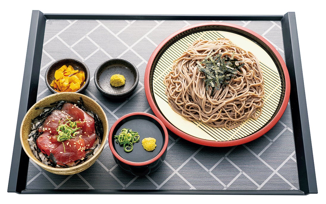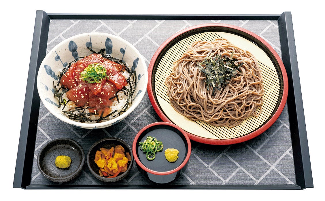 つるっとした食感を楽しめるざるそばと、マグロを甘めの醤油だれに漬け込んだまぐろ丼セットです。