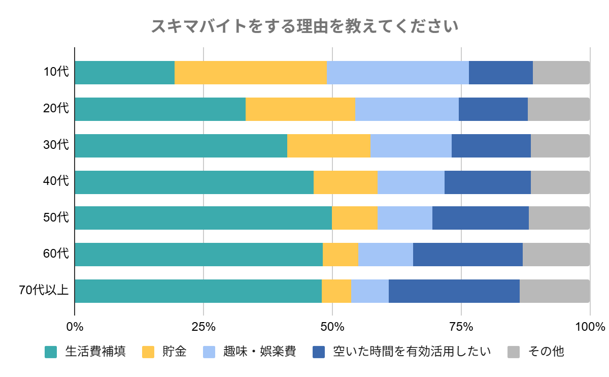 年代別に見ると、50代が最も「生活費補填」のためにスキマバイトをしていることがわかった(50.0%)。