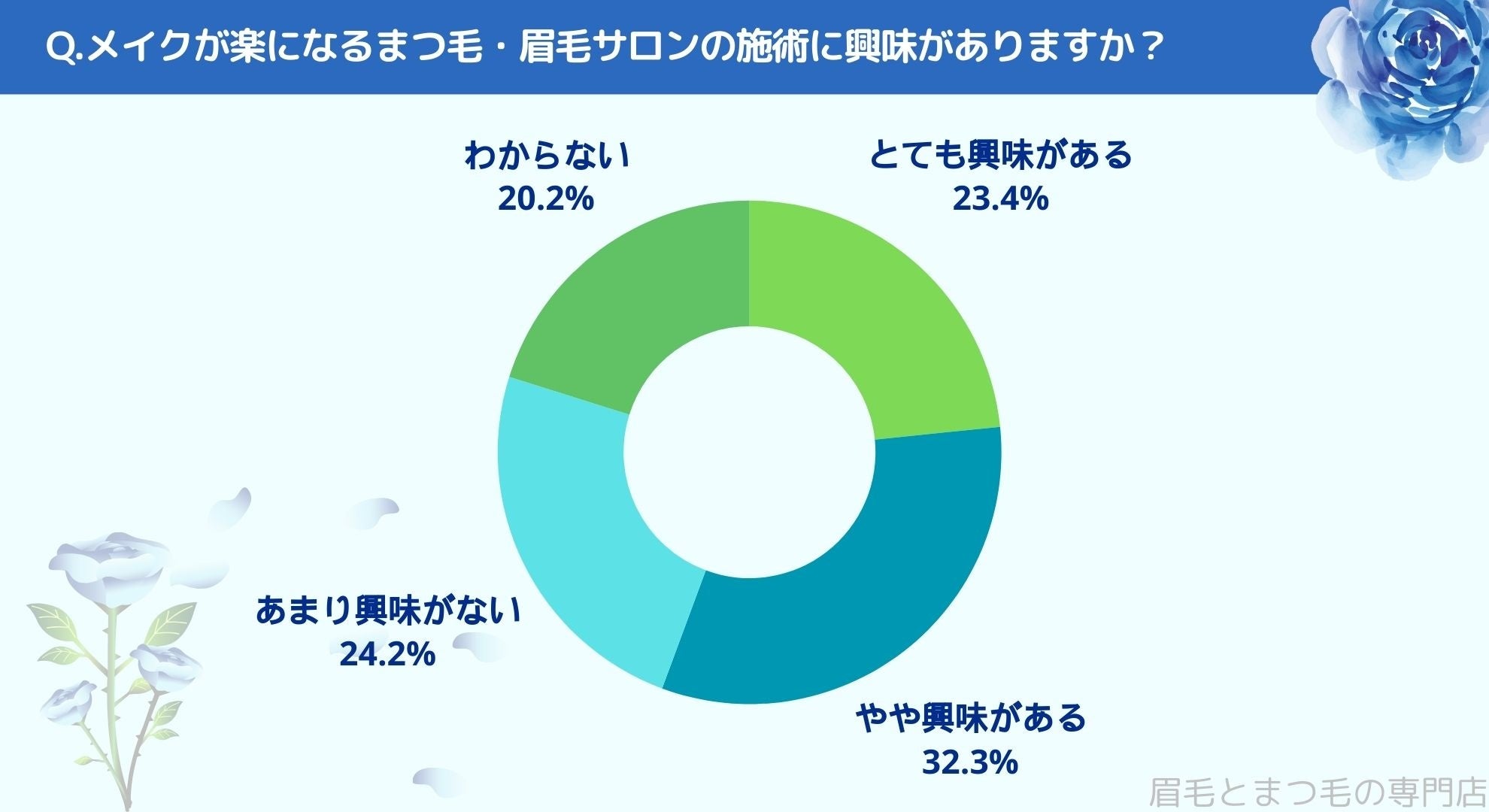 メイクが楽になるまつ毛・眉毛サロンの施術に興味があるかお聞きしたところ「とても興味がある(23.4%)」、「やや興味がある(32.3%)」、「あまり興味がない(24.2%)」、「わからない(20.2%)」という結果になりました。