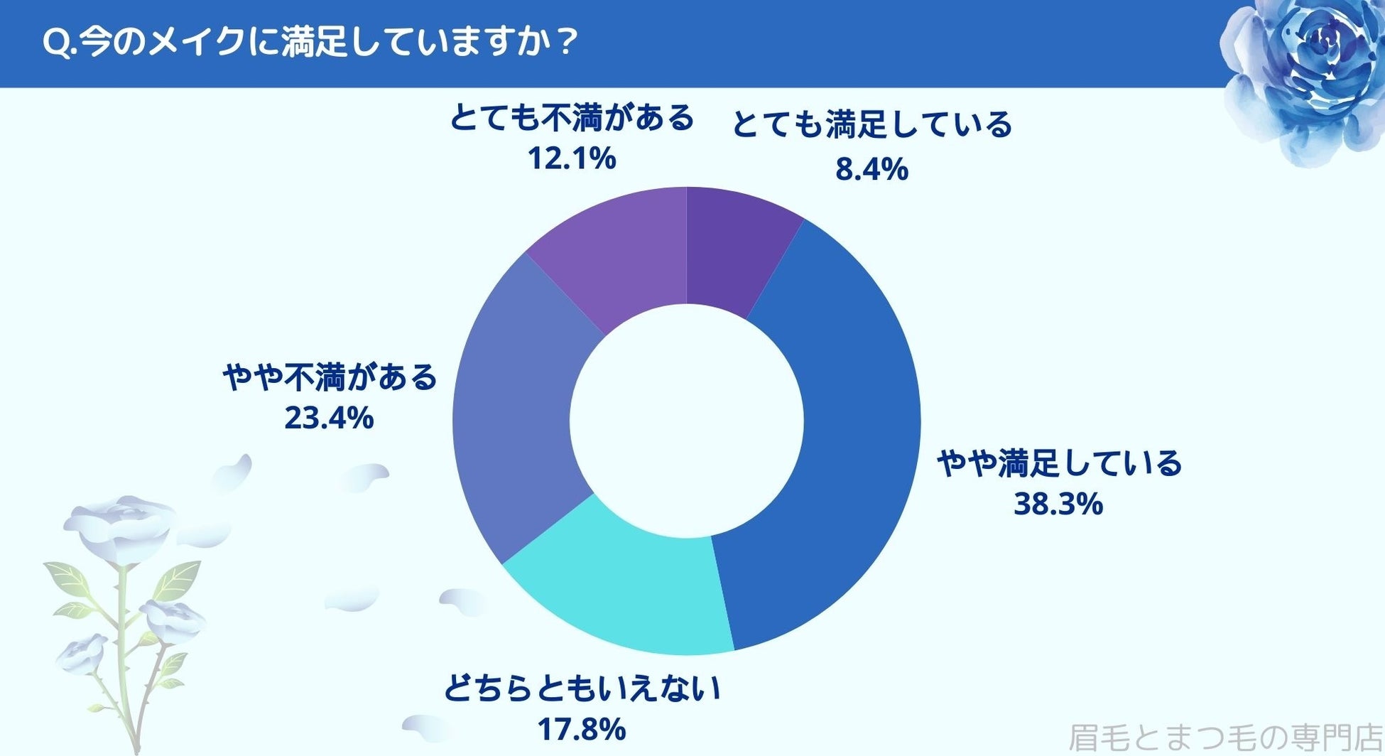 今のメイクに満足しているかお聞きしたところ「とても満足している(8.4%)」、「やや満足している(38.3%)」、「どちらともいえない(17.8%)」、「やや不満がある(23.4%)」、「とても不満がある(12.1%)」という結果になりました。
