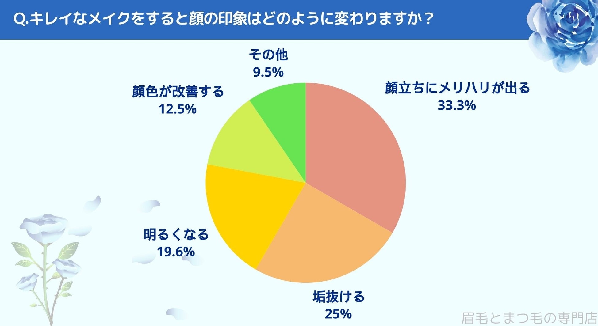 キレイなメイクをすることで顔の印象がどう変わるのかお聞きしたところ「顔立ちにメリハリが出る(33.3%)」、「垢抜ける(25%)」、「明るくなる(19.6%)」、「顔色が改善する(12.5%)」、「その他(9.5%)」という結果になりました。