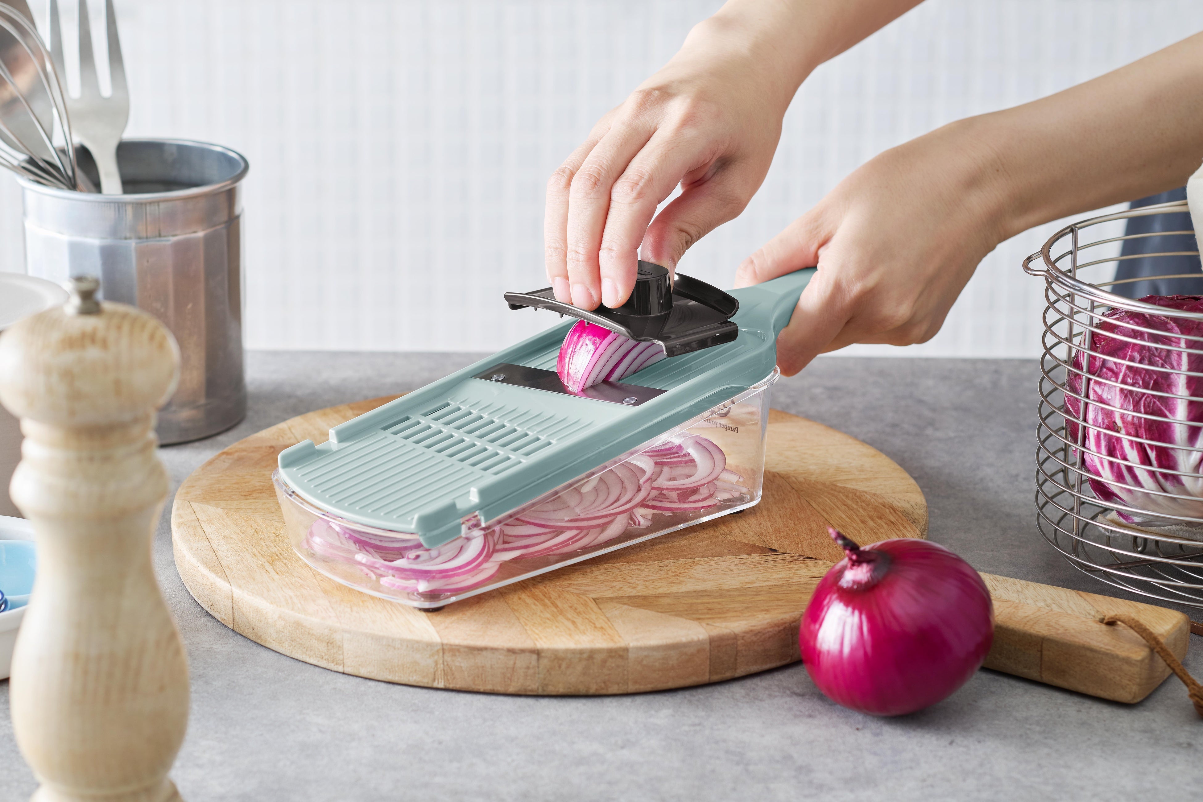 「薄切り」「細切り」「薬味おろし」ができる1台3役で、サラダやスープ、ちょっとした薬味づくりなど、さまざまな調理で大活躍!鍋やボウル、お皿の上でもサッと使える使い勝手の良さが魅力です。丸洗いができるのでお手入れも簡単!