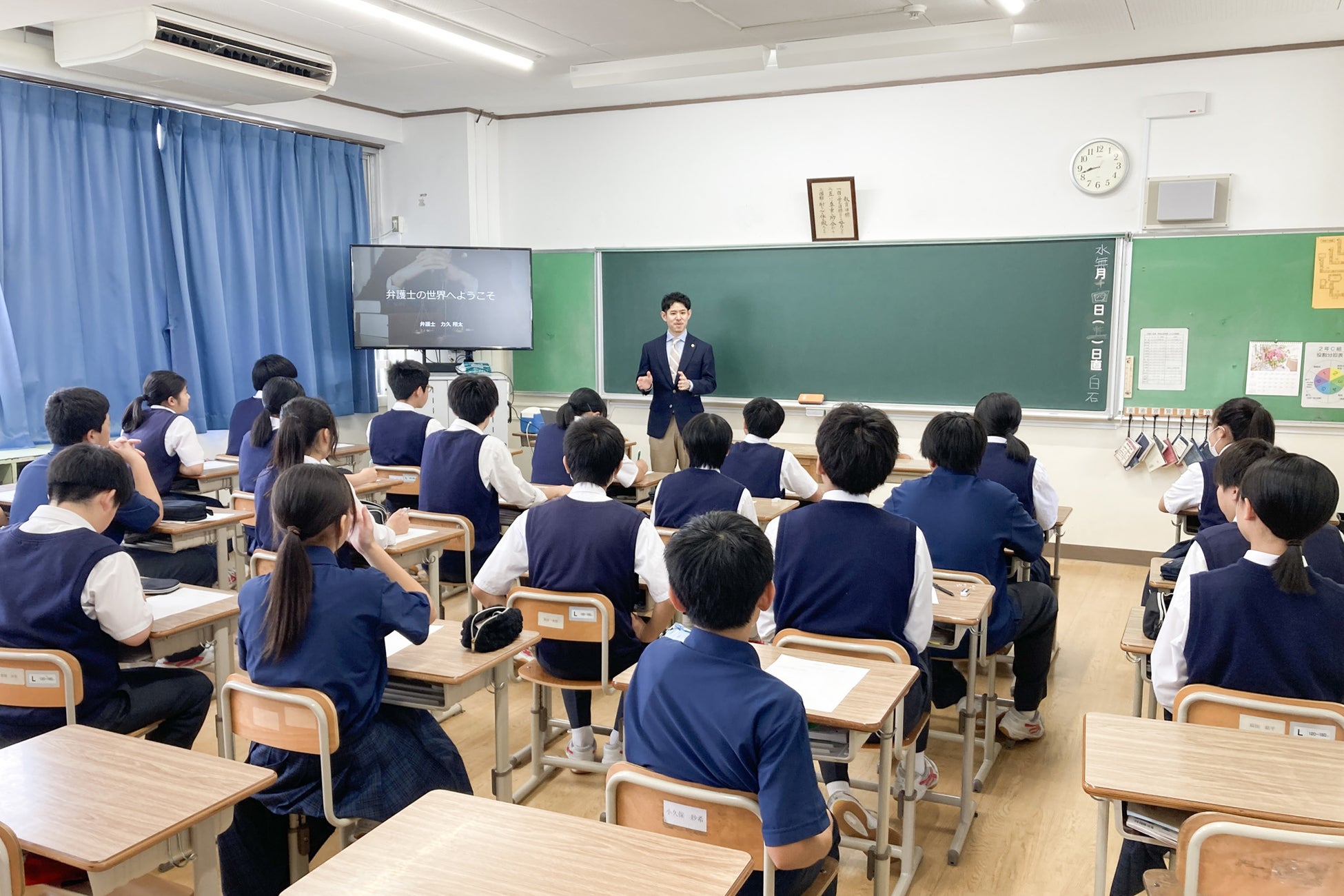 「キャリア講話会」とは、中学生が各業界の職業人からの話を通じ、 将来の進路選択や職業に対する理解を深めるために行われているイベントです。今回はアディーレから力久翔太弁護士が登壇し、弁護士の仕事について話しました。
