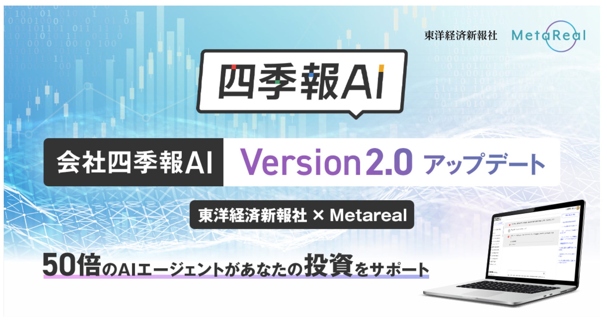 株式会社東洋経済新報社(本社:東京都中央区、代表取締役社長:田北 浩章)は、株式会社メタリアル(本社:東京都千代田区、代表取締役:五石 順一)と共同で、現行Versionよりも大幅に機能アップした「四季報AI」のVersion2の提供を2024年12月5日より開始いたしました。