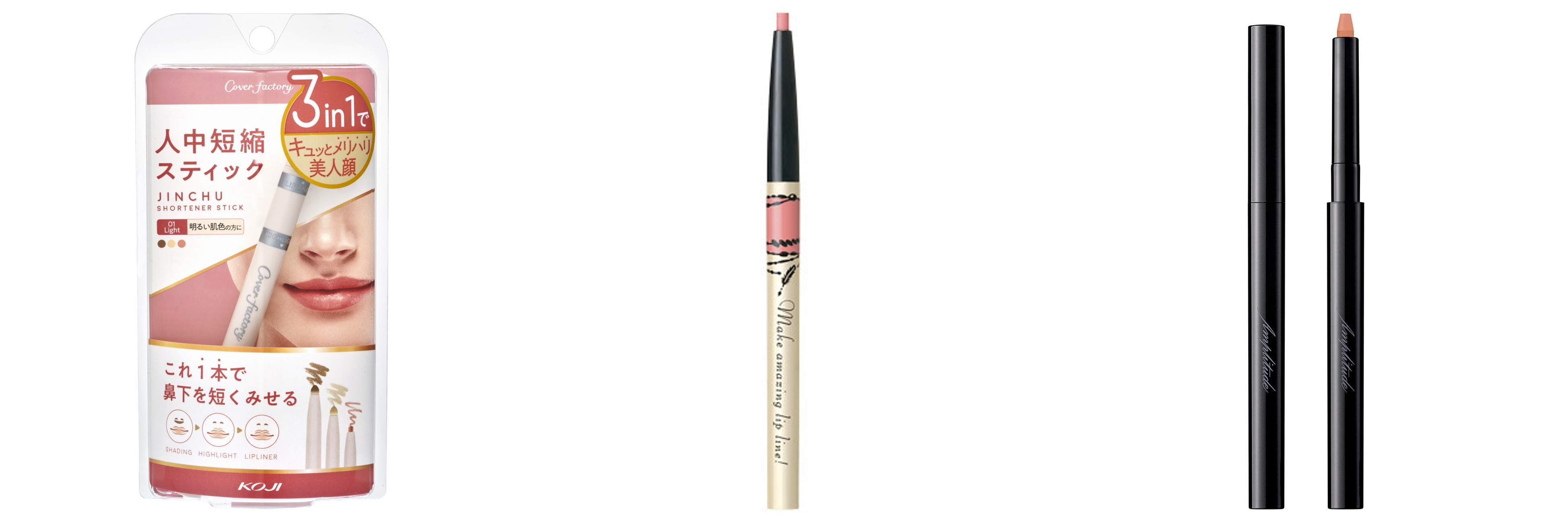 (右)カバーファクトリー 人中短縮スティック / 01 ライト、インテグレート リップフォルミングライナー / PK750、Amplitude(アンプリチュード) コンスピキュアス リップライナー / 14 ライトベージュ