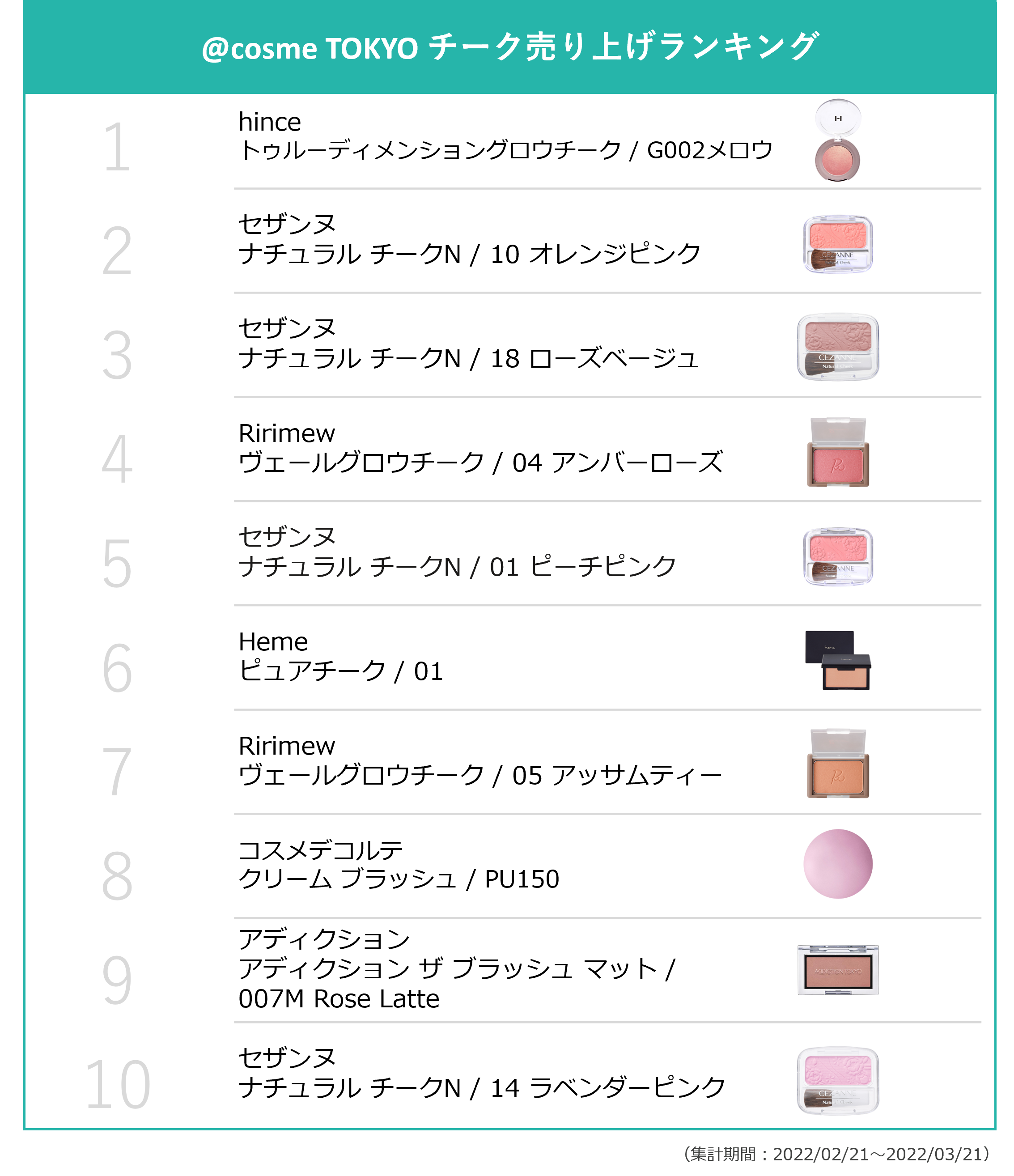 外出機会も増え、人前でマスクをはずす機会も多くなってきたこの頃。マスクをはずした時でも顔に血色感があるようにとチークを再開した人も多いのではないでしょうか。原宿駅前にある「@cosme TOKYO」のチークカテゴリの売り上げを見てみると、上位には華やかなピンクや血色感のあるローズといった春らしいカラーが多くランクインしています。その他には、肌馴染みのいいベージュカラー、後半には“透明感”を演出してくれるカラーであるパープルカラーがランクインしています。