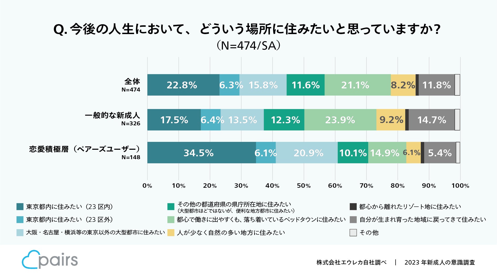 新成人に「今後の人生においてどういう場所に住みたいと思っていますか?」と聞くと、56.5%が東京および大都市圏、県庁所在地に住みたいと回答し、新成人の都会志向がうかがえます。恋愛積極層(ペアーズユーザー)と一般的な新成人の違いをみると、恋愛積極層(ペアーズユーザー)で大都市圏、県庁所在地に住みたいと答えた人が71.6%であるのに対し、一般的な新成人は49.7%となり、恋愛積極層(ペアーズユーザー)の方がより都会志向が強い結果となりました。