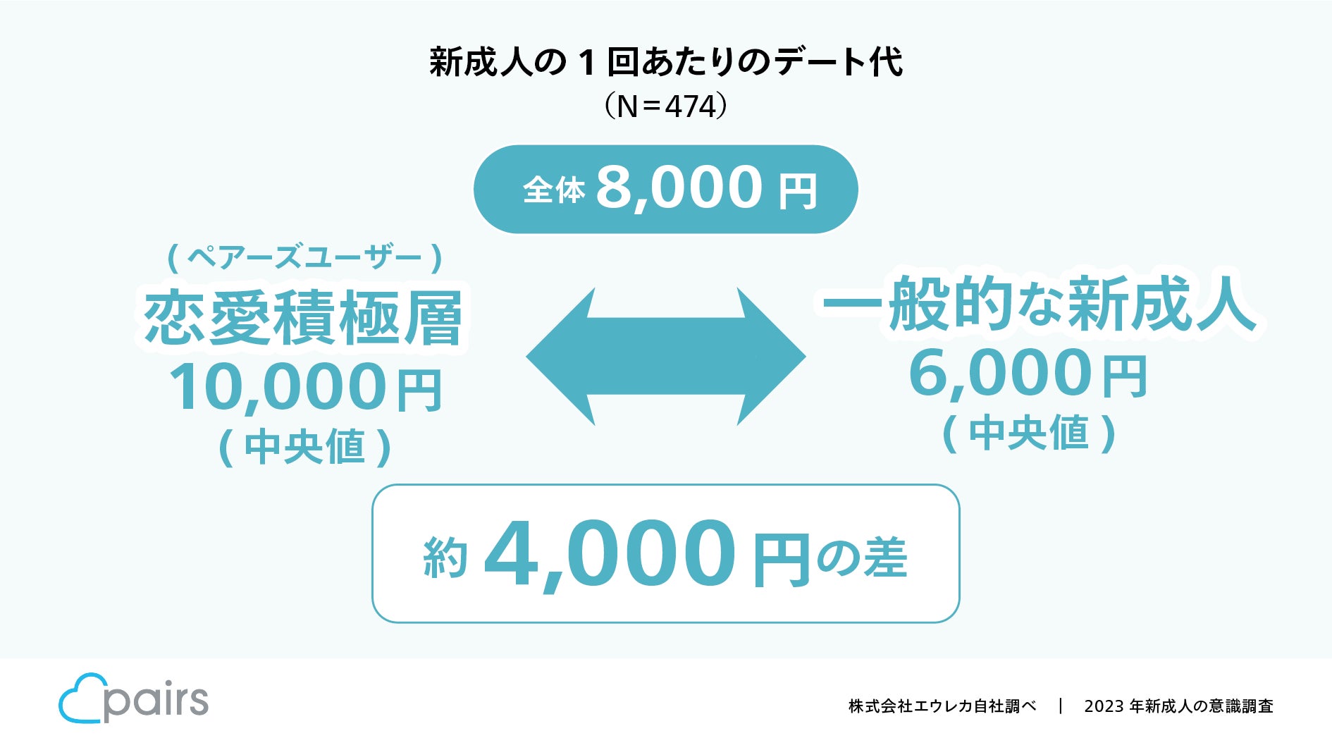 【デート代】恋愛積極層(ペアーズユーザー)は10,000円で、一般的な新成人は6,000円という結果に。恋愛積極層(ペアーズユーザー)は一般的な新成人と比べ4,000円高い結果に