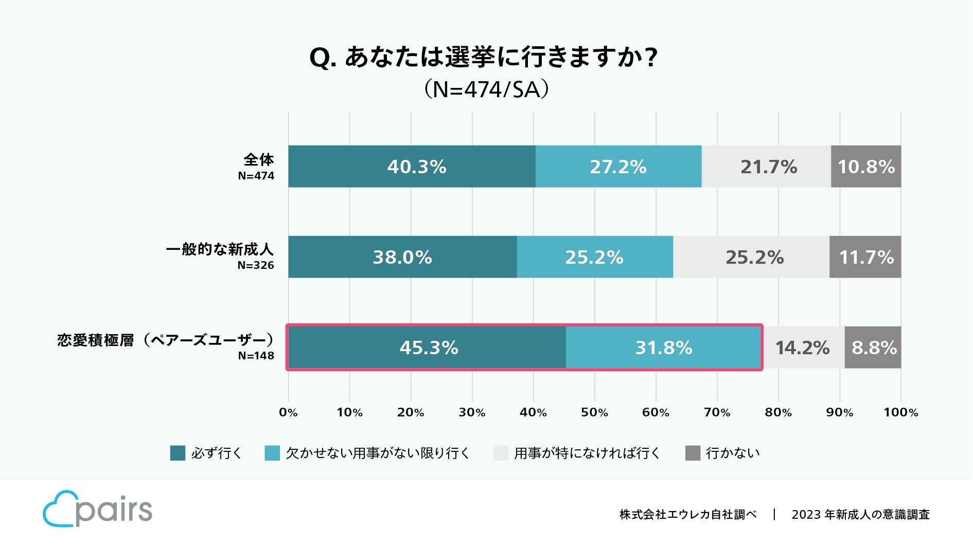恋愛積極層(ペアーズユーザー)と一般の新成人を比較すると、恋愛積極的層のほうが「必ず行く」「欠かせない用事がない限り行く」という回答が多く、積極的な投票への意向がより強く見られました。